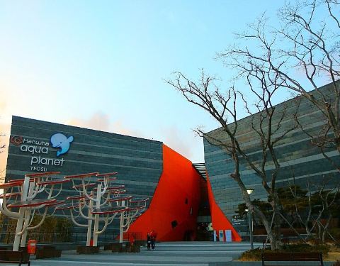 韩华集团在2012丽水世博会中设立了韩国国内大规模的水族馆““Aquaplanet”,”丽水Aqua Planet水族馆拥有相当于4层楼的高度,总面积达16400㎡,并且拥有6000t级的水族箱,实属韩国国内大的水族馆。该水族馆的规模是韩国现有的首尔63海底世界(1000t)的6倍,也是首尔COEX水族馆(2300t)和釜山水族馆(3500t)的两至三倍。水族馆在世博会结束后也将作为世博会的设施之一而不被拆除。它是一间符合丽水世博会主题——“有生命的海洋,会呼吸的沿岸”“的环保型水族馆,该水族馆也因此吸引了各界的眼球。水族馆的顶部设置了应用太阳光发电技术的设施,水族馆中生存的海洋动物们可以通过利用太阳能的生命保障系统来获得适合自己生存的环境。另外,为了向海洋生物们提供生存必需的光线,水族馆中设置了可以从太阳光中获取光线的“太阳光采光区域”;为了向鱼医生提供符合其生存的水温,水族馆还设置了从太阳能中获取动力的环保水族箱——”鱼医生区域”。水族馆分海洋动物馆、生态馆和体验馆三个区域,白海豚、贝加尔海豹、南美海狗以及海龙等280余种海洋生物将在水族馆中进行展示,展示的总数量达到3万3千只。