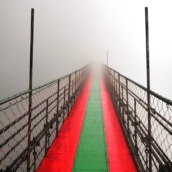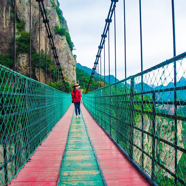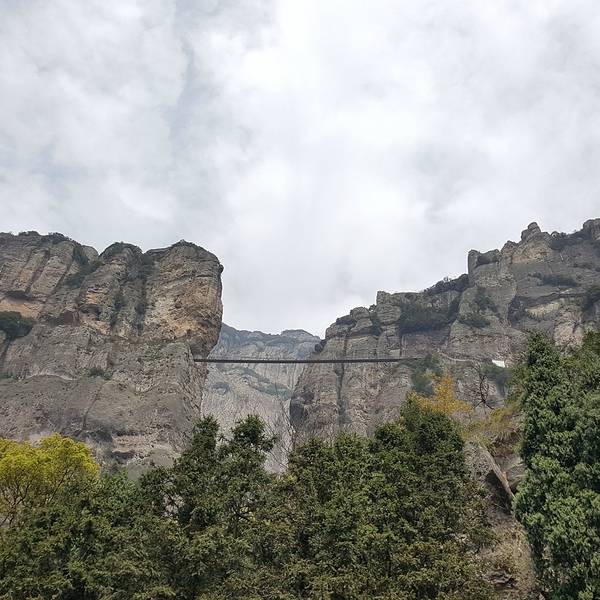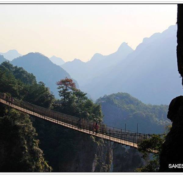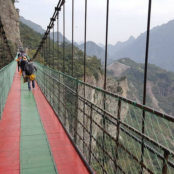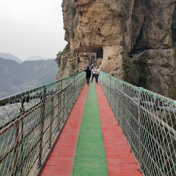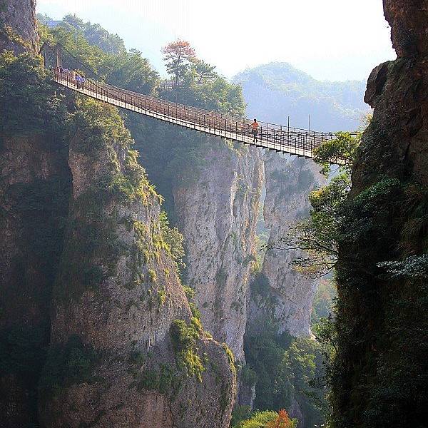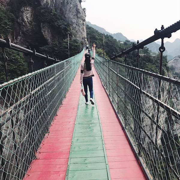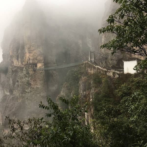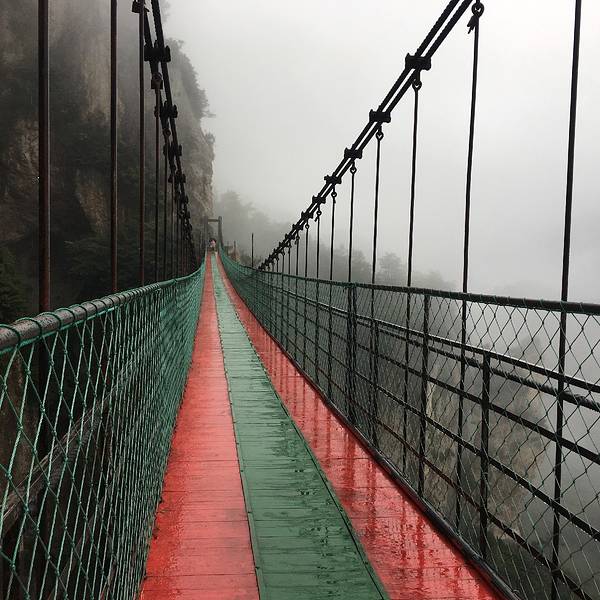 在方洞景区里面游览比较有趣,一侧是万丈悬崖,眼前又是雾气缭绕,亦真亦幻虚虚实实地不知不觉就来到了这座两山之间的吊桥面前。