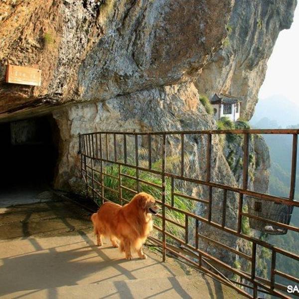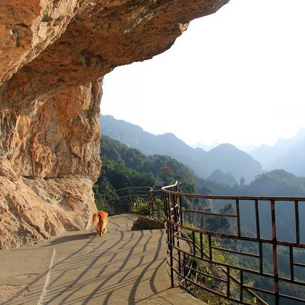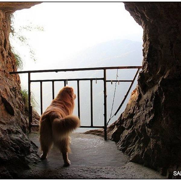 方洞险峻是天涯,人间处处是温暖。方洞其实不是方的...景区人员看到我一个人这么早带条大金毛来登山,感动了,没要我的停车费,但是门票还是要买的,老规矩,1.2米以下的不用买票,所以萨克斯自然就进了景区。
