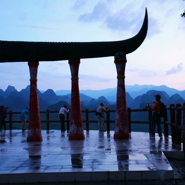 在三排瑶寨的对面,是一个大山谷,谷中群峰突兀,百峰争雄,仿如千军万马,汹涌而来。伫立于此,感觉有如君临帅台,点兵阅将,故此景得名“万山朝王”非常贴切。据说香港一位摄影爱好者在此拍了一张全景图,小小画面中竟然有99座山峰,令人拍案称奇,因而得了当年摄影金奖。附近的油岭排,周围的景色被称为万山朝王王中之王。这里成片都是喀斯特溶岩地貌,山形千姿百态, 有“第二丹霞”之誉。由于处在群山之中,使这里保留了较为完整的排瑶传统风俗,民间文化艺术也较为丰富,近年来,大型的“耍歌堂”活动均在这里举行,故得“油岭歌堂”之名。