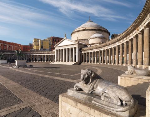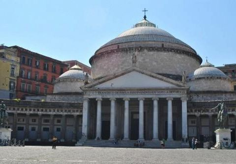保罗圣方济教堂位于那不勒斯的较大的广场——普雷比席特广场的西侧,是一座天主教堂。这座建堂以模仿罗马万神殿而闻名,主殿是一座圆形的带有穹顶的建筑,里面有着精美的壁画,喻示着苍穹与宇宙之中的威严所在。这座教堂建于19世纪初,起初是统治那不勒斯的波拿巴家族的国王若阿尚·缪拉建造,他规划了广场及其建筑以献给拿破仑。拿破仑失势后,波旁王朝复辟,斐迪南四世继续完成建筑,但是在1816年建成后归属教会,奉献给16世纪曾在此修道的保罗圣芳济,遂以其名字命名至今。站在大教堂前,立感其宏伟宽广的气势。