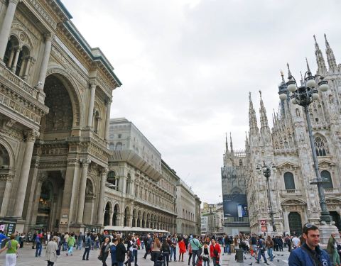 米兰大教堂广场位于米兰市中心,周边有很多重要的建筑,其中米兰的地标米兰大教堂就坐落于此。广场随着大教堂的修建逐步发展起来,并以大教堂命名。广场中央耸立着意大利王国第一任国王维多利奥·埃玛努埃尔二世的骑马铜像。广场周边还有埃马努埃莱二世长廊、新古典主义建筑风格的王宫、大教堂博物馆等一系列的重要建筑,散发出浓郁中世纪风情。广场上可以看到成群悠闲信步的鸽子,有时到了傍晚还能看到随兴演出的街头表演。广场附近汇聚了很多商场、购物中心、精品专卖店和高级餐馆,是米兰知名的休闲购物区域。