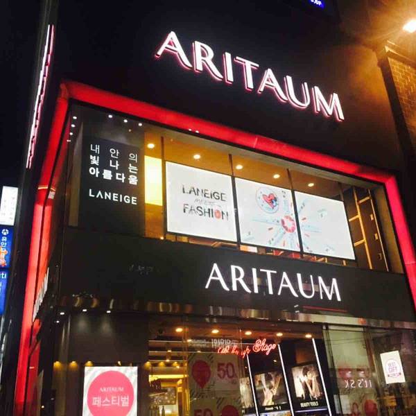 ARITAUM 是主要经营爱茉莉太平洋集团所属品牌的一家化妆品店。作为韩国最大的化妆品公司,爱茉莉旗下家喻户晓的品牌兰芝、梦妆、IOPE 等都可以在这里轻松找到。ARITAUM 的梨大店正好距离梨大正门不远,是一栋独立的一层小楼,店面宽敞大气,从护肤品、彩妆到化妆用具等选择多样。