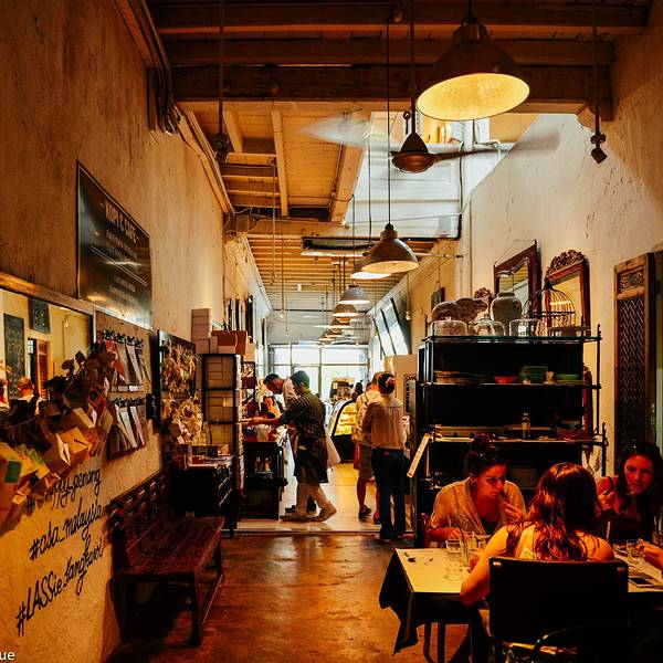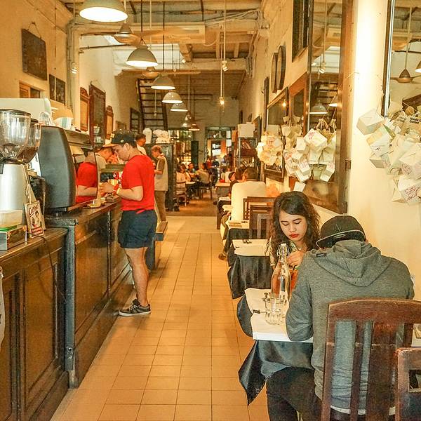这是一个咖啡馆,新形式的咖啡馆,结合了阅读、艺术、展览、美食的一个空间,装修风格复古风,占三间门面,内部设有多个空间,有Kopi C.Espresso、BTB & Restaurant、Beach Street Bakery、 14Chairs、Vine & Sin...