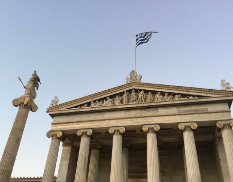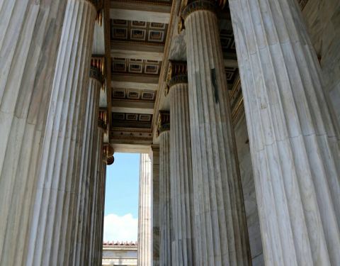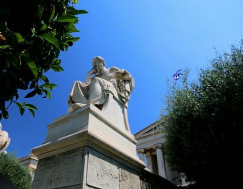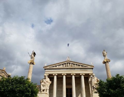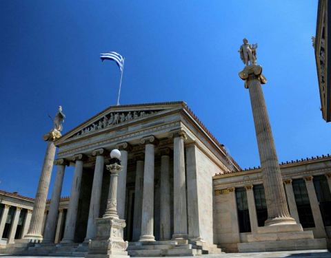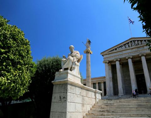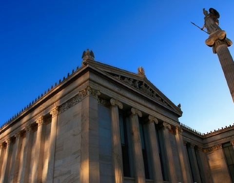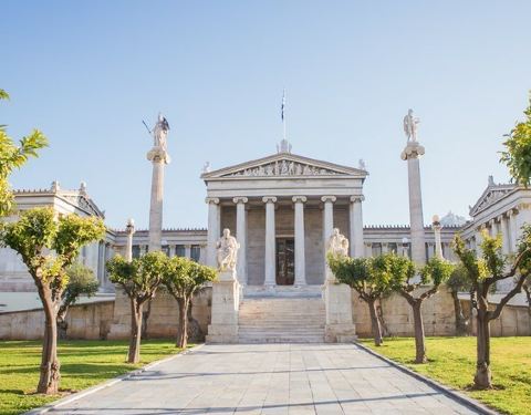 雅典科学院是新古典主义风格的建筑杰作,与旁边的国家图书馆和雅典大学合称“新古典主义三部曲”。建于19世纪,由丹麦建筑师韩森兄弟模仿卫城伊瑞克提翁神殿的设计修建,吸取了希腊古典建筑的精髓。参观雅典科学院,不可错过学院门口的4个雕像以及门楣上众神的雕塑。 雕塑 雅典科学院在三座新古典建筑的南侧, 两根高高的大理石神像柱的顶端站立着希腊褚神中较闻名的两位:左侧是手持长矛和盾牌象征着智慧和勇敢的雅典娜神,右侧是左手持里拉琴代表着光明和音乐的阿波罗神,这两位也是雅典人较喜欢的两位大神。在入口处的台阶两侧还有两位古希腊伟大的哲学家的大理石雕像,左侧是苏格拉底,右侧是柏拉图,他们用深邃的目光注视着每一位进入雅典学院的人。 雅典科学院的门楣上还有一排众神的雕塑,中央的是众神之主宙斯,其他列神分别站于其两侧。学院内部不可以随便进入,但游客也主要就是参观科学院门口的四个雕像。