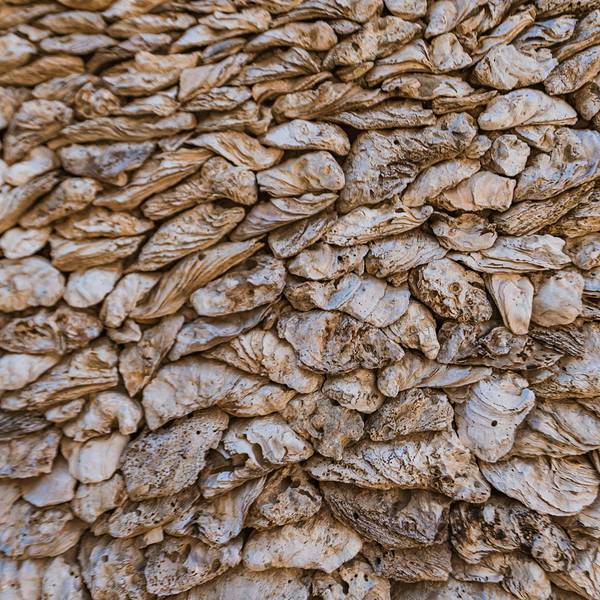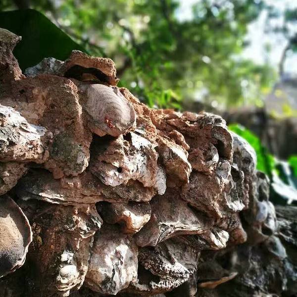 看,就是这样用稻草和土建造的。凑近了仔细看,可以看到里面的稻草他又介绍说这海蛎子壳儿都是古人用手切割的,并且一层一层非常巧妙的叠加在一起,不留一点缝隙。