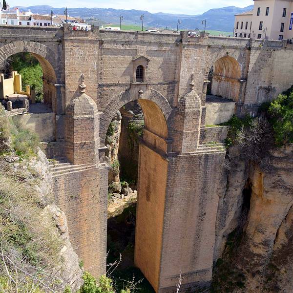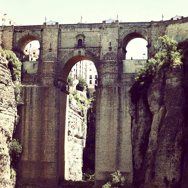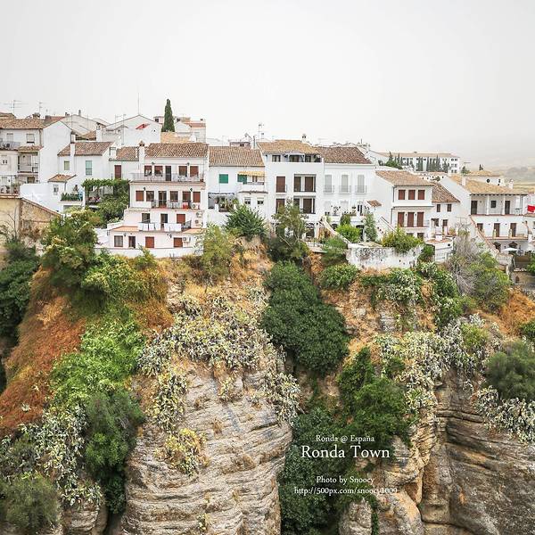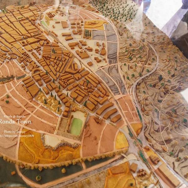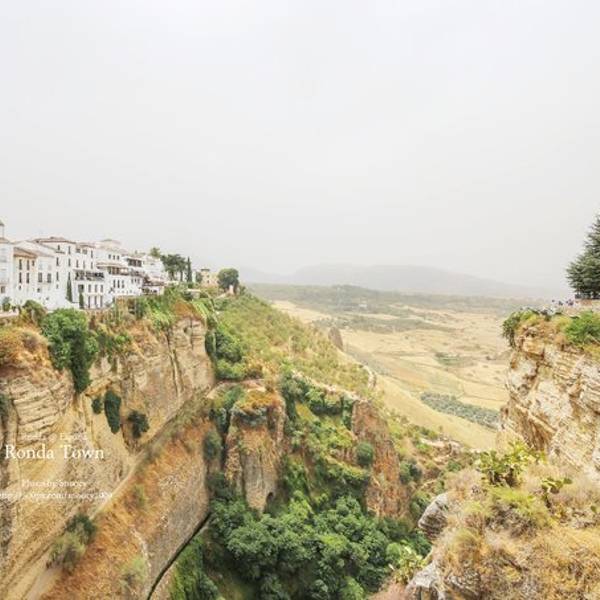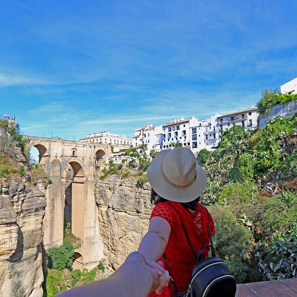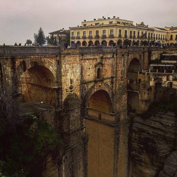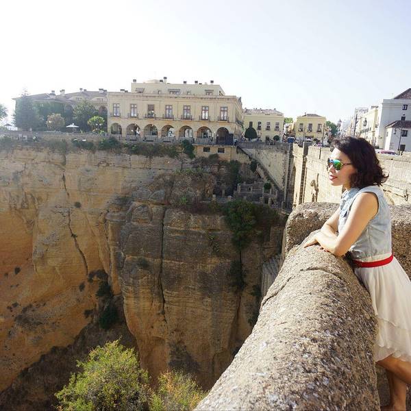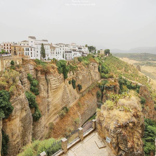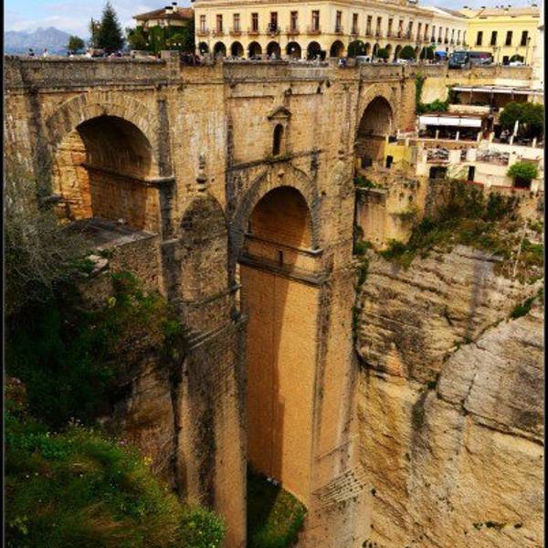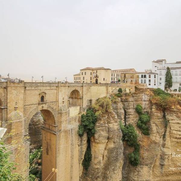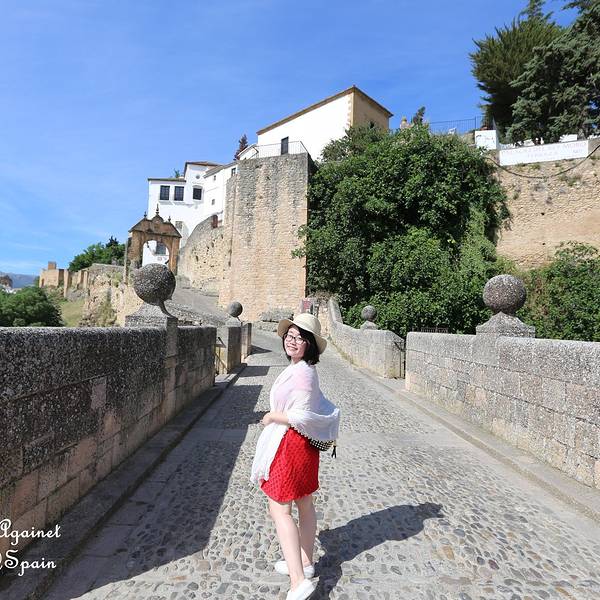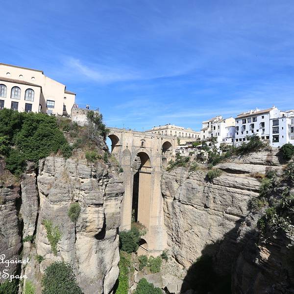 新桥是石板铺砌而成,这些石块因为经历过岁月的洗礼,所以变得像一块块黑玛瑙一样黝黑发亮。站在桥上环顾四周,视野能及的都是绵延的美丽龙达山脉。抬抬头,望望天,广阔无边,若是在这个地方上谈情说爱,真不愧为私奔小镇!宏伟的新桥横跨在塔霍峡谷(El Tajo gorge)上,建成于1793年。有谣言声称:这座桥梁的建筑师阿尔德维拉(Martín de Aldehuela)试图在桥梁侧面雕刻上日期时,不小心从桥上失足跌下而死。海明威的名著《丧钟为谁而鸣》(For Whom the Bell Tolls)中就讲述了龙达镇居民将“法西斯主义者”用棍棒和连枷打死,并将尸首抛下了悬崖。没来过龙达的人,光看照片是无法感受到新桥所带给人的那种震撼。龙达地理位置的特殊性给了这个震撼提供了得天独厚的条件——新桥高达98米,相当于30层楼高,下面就是深渊,白色的房子就造在悬崖边上, 沿着新桥边上的小路往前走,可以看到桥下的深谷,深谷里的房子,这种错落有致的风景,用平面的照片是无法表现出的。新桥底部还有一个讲述新桥历史的小博物馆,有兴趣的可以去参观一下。