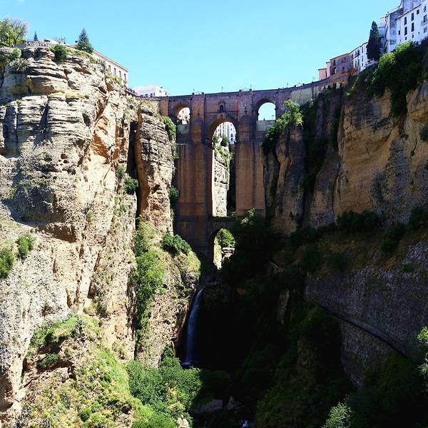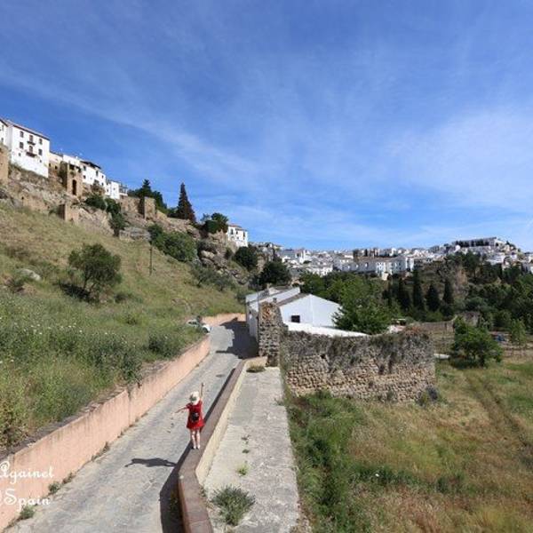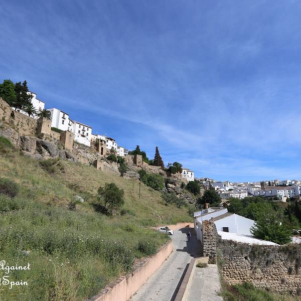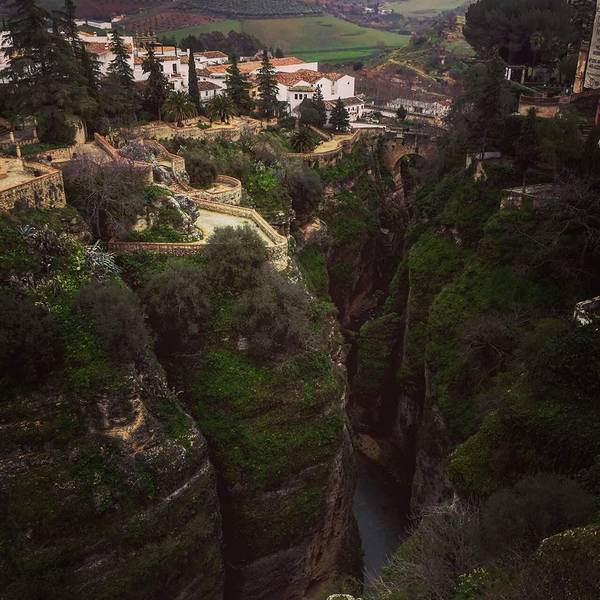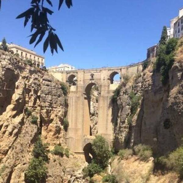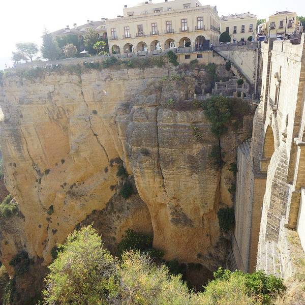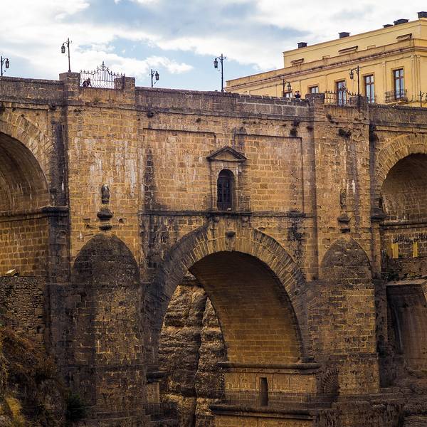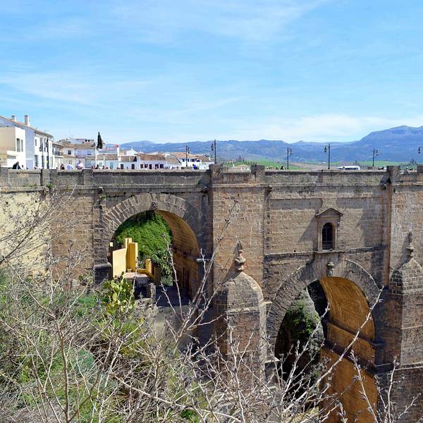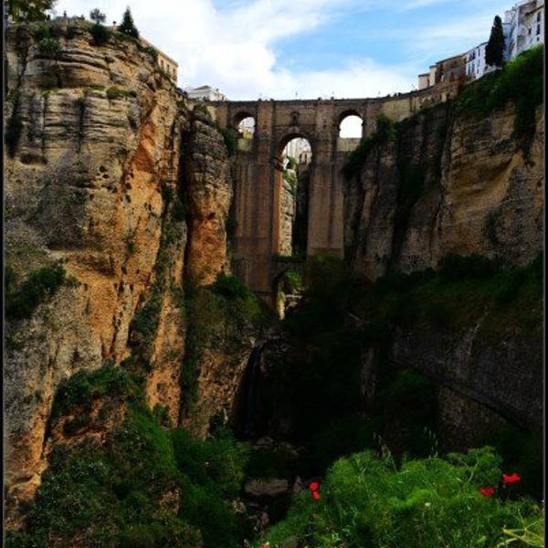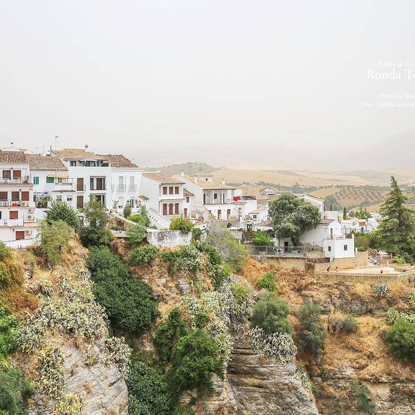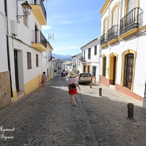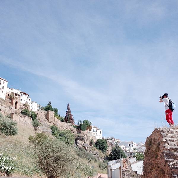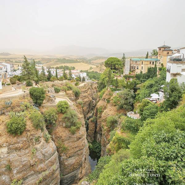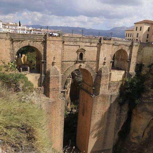 新桥是石板铺砌而成,这些石块因为经历过岁月的洗礼,所以变得像一块块黑玛瑙一样黝黑发亮。站在桥上环顾四周,视野能及的都是绵延的美丽龙达山脉。抬抬头,望望天,广阔无边,若是在这个地方上谈情说爱,真不愧为私奔小镇!宏伟的新桥横跨在塔霍峡谷(El Tajo gorge)上,建成于1793年。有谣言声称:这座桥梁的建筑师阿尔德维拉(Martín de Aldehuela)试图在桥梁侧面雕刻上日期时,不小心从桥上失足跌下而死。海明威的名著《丧钟为谁而鸣》(For Whom the Bell Tolls)中就讲述了龙达镇居民将“法西斯主义者”用棍棒和连枷打死,并将尸首抛下了悬崖。没来过龙达的人,光看照片是无法感受到新桥所带给人的那种震撼。龙达地理位置的特殊性给了这个震撼提供了得天独厚的条件——新桥高达98米,相当于30层楼高,下面就是深渊,白色的房子就造在悬崖边上, 沿着新桥边上的小路往前走,可以看到桥下的深谷,深谷里的房子,这种错落有致的风景,用平面的照片是无法表现出的。新桥底部还有一个讲述新桥历史的小博物馆,有兴趣的可以去参观一下。
