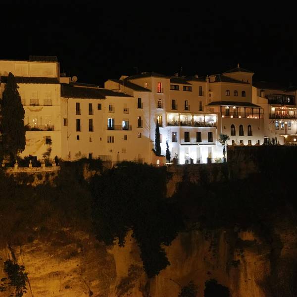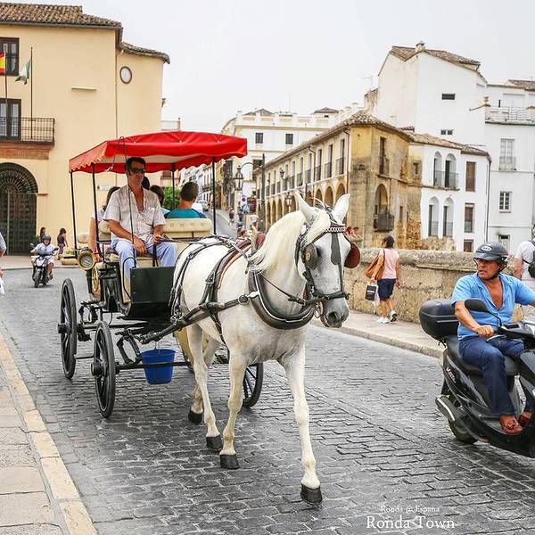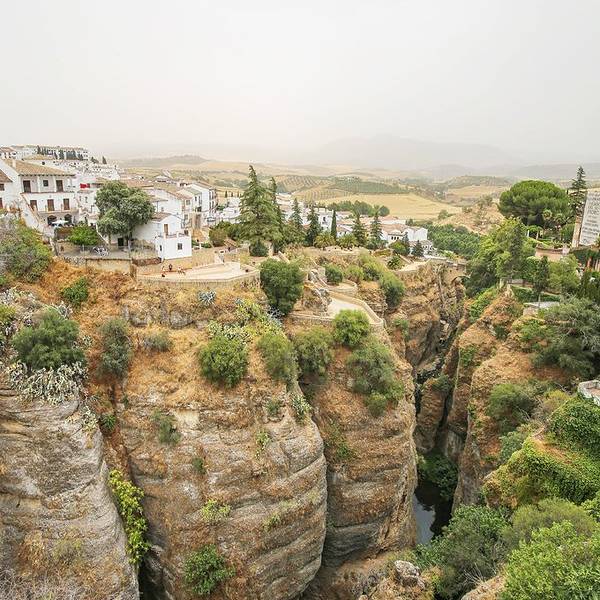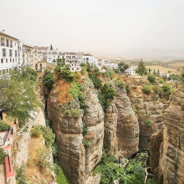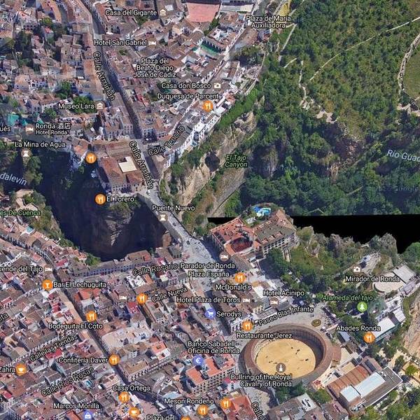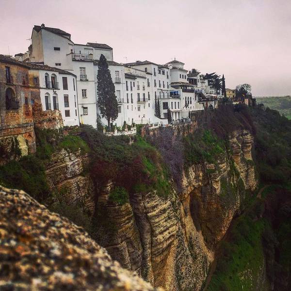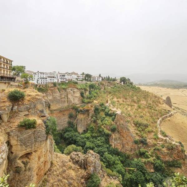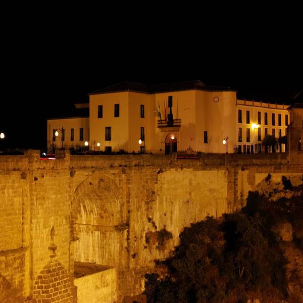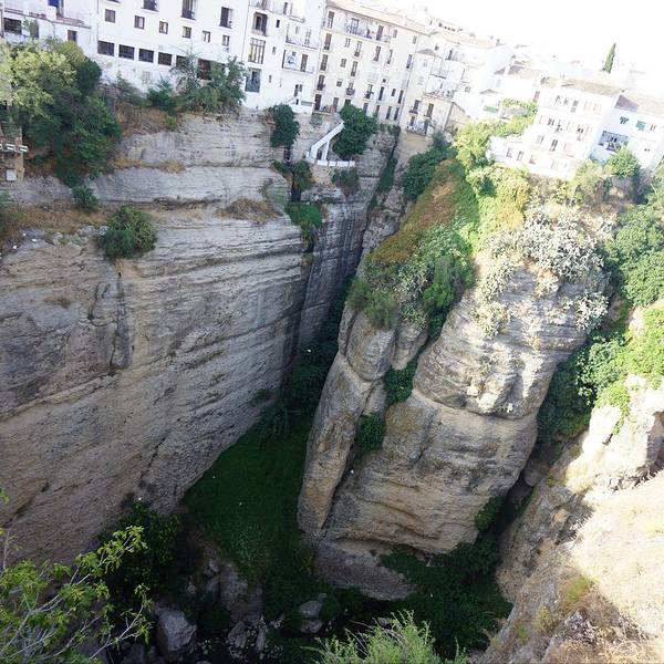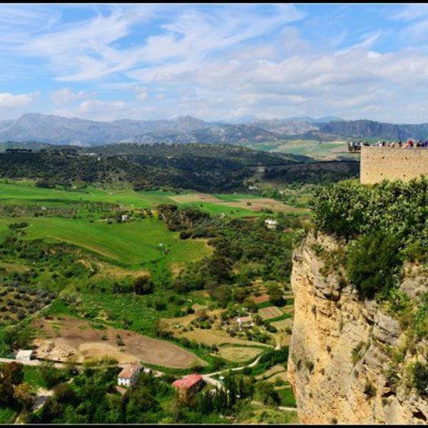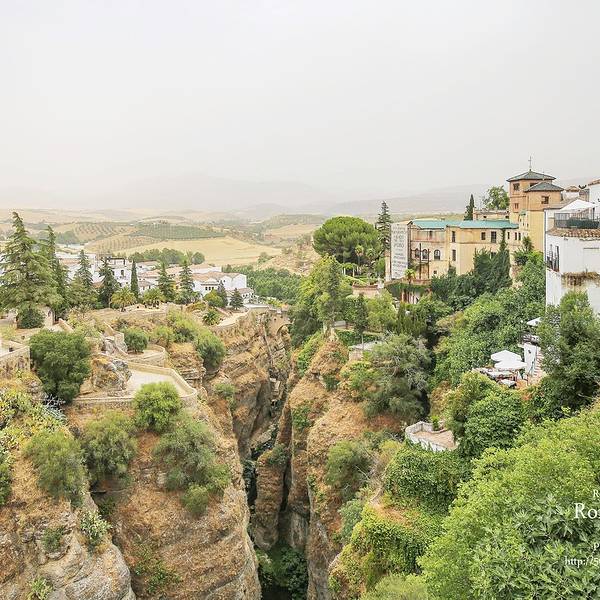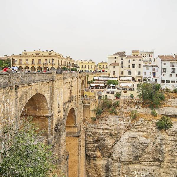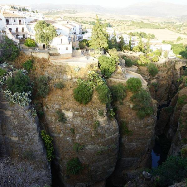 新桥是石板铺砌而成,这些石块因为经历过岁月的洗礼,所以变得像一块块黑玛瑙一样黝黑发亮。站在桥上环顾四周,视野能及的都是绵延的美丽龙达山脉。抬抬头,望望天,广阔无边,若是在这个地方上谈情说爱,真不愧为私奔小镇!宏伟的新桥横跨在塔霍峡谷(El Tajo gorge)上,建成于1793年。有谣言声称:这座桥梁的建筑师阿尔德维拉(Martín de Aldehuela)试图在桥梁侧面雕刻上日期时,不小心从桥上失足跌下而死。海明威的名著《丧钟为谁而鸣》(For Whom the Bell Tolls)中就讲述了龙达镇居民将“法西斯主义者”用棍棒和连枷打死,并将尸首抛下了悬崖。没来过龙达的人,光看照片是无法感受到新桥所带给人的那种震撼。龙达地理位置的特殊性给了这个震撼提供了得天独厚的条件——新桥高达98米,相当于30层楼高,下面就是深渊,白色的房子就造在悬崖边上, 沿着新桥边上的小路往前走,可以看到桥下的深谷,深谷里的房子,这种错落有致的风景,用平面的照片是无法表现出的。新桥底部还有一个讲述新桥历史的小博物馆,有兴趣的可以去参观一下。