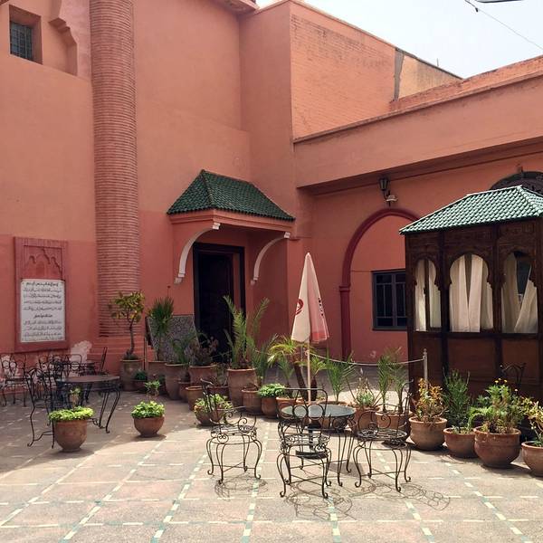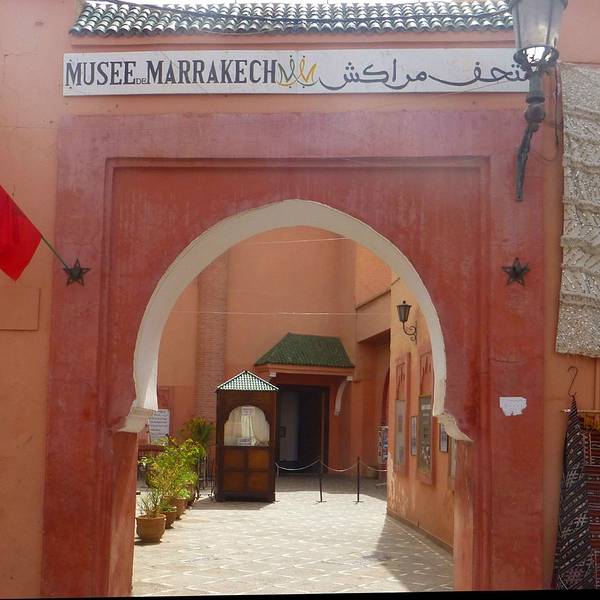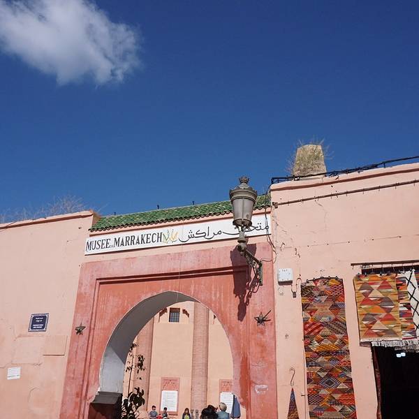 金骆驼 门外有人要当导游或者兜售一天游的包车,马拉喀什不大,步行或打的去主要景点非常方便。十分精致马拉喀什博物馆Museum of Marrakesh的院子外墙砖红色,外面有明显标示,当地人都知道MUSEUM,很容易找到。博物馆是一个阿拉伯式庭院,四周粗大的雕花柱子,地面大理石的花纹雅致精细,大型的水池是这种庭院的的标...马拉喀什博物馆Museum of Marrakesh的院子外墙砖红色,外面有明显标示,当地人都知道MUSEUM,很容易找到。博物馆是一个阿拉伯式庭院,四周粗大的雕花柱子,地面大理石的花纹雅致精细,大型的水池是这种庭院的的标配。导游说,一般正房是诵经场所,外面是供信徒清洗的水池,现在干燥状态。正中大型吊灯很吸引眼球,巨大的灯罩是金属丝编就。十分精致。内部四周布满石雕和木雕,几何图案,对称细密。博物馆没有很多展品,有一些历史照片和物件,精美建筑的布局和美轮美奂的装饰也是历史的一部分吧。这个古老的庭院正在举办一个现代艺术展览,有的展品和画作很现代,这倒给这间古老的大宅增添了生动活波的气氛。博物馆院子里有露天咖啡厅,但是到我们离开时已近中午还没有开门。院子里一个小商店,陈列的明信片上可以看到最完美的马拉喀什的美景,我们跟着画面又游览了一遍主要景点,真可谓穿越千年,回到了中世纪。门票每人50MAD (1RMB=1.46MAD)。网上有关套票的信息,经询问售票处,被告知已经不再实行。门外有人要当导游或者兜售一天游的包车,马拉喀什不大,步行或打的去主要景点非常方便。摩洛哥导游须持执照,打击黑导游。