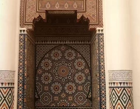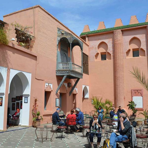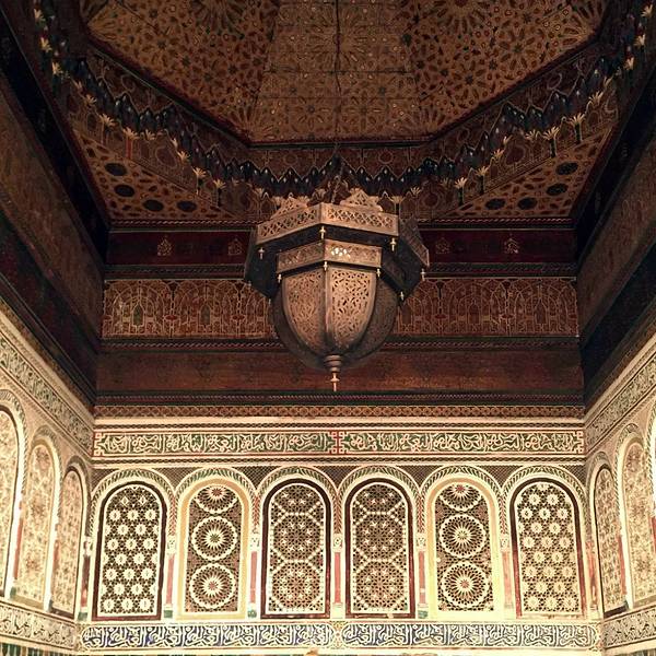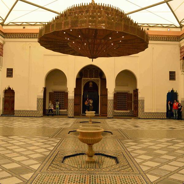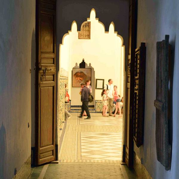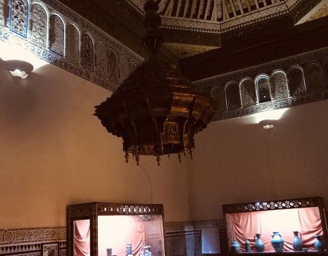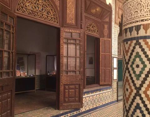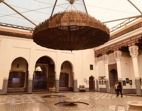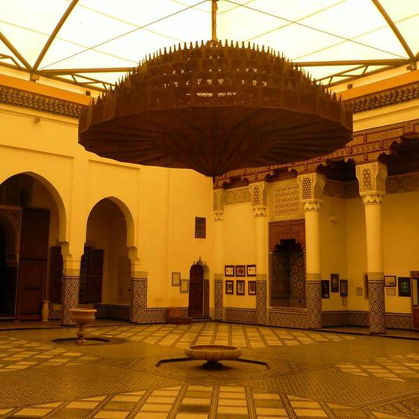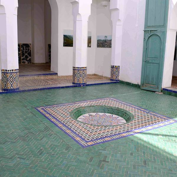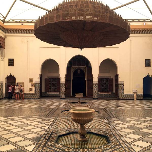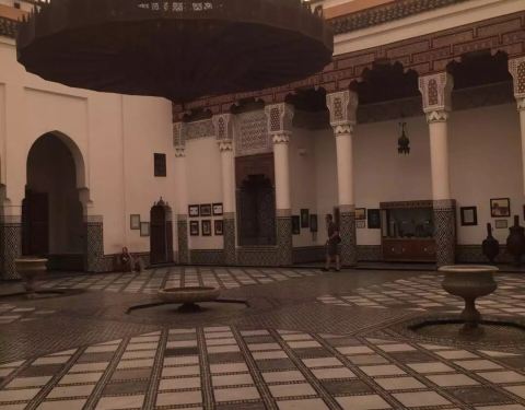 马拉喀什博物馆Museum of Marrakesh的院子外墙砖红色,外面有明显标示,当地人都知道MUSEUM,很容易找到。博物馆是一个阿拉伯式庭院,四周粗大的雕花柱子,地面大理石的花纹雅致精细,大型的水池是这种庭院的的标配。导游说,一般正房是诵经场所,外面是供信徒清洗的水池,现在干燥状态。正中大型吊灯很吸引眼球,巨大的灯罩是金属丝编就。十分精致。内部四周布满石雕和木雕,几何图案,对称细密。博物馆没有很多展品,有一些历史照片和物件,精美建筑的布局和美轮美奂的装饰也是历史的一部分吧。这个古老的庭院正在举办一个现代艺术展览,有的展品和画作很现代,这倒给这间古老的大宅增添了生动活波的气氛。博物馆院子里有露天咖啡厅,但是到我们离开时已近中午还没有开门。院子里一个小商店,陈列的明信片上可以看到最完美的马拉喀什的美景,我们跟着画面又游览了一遍主要景点,真可谓穿越千年,回到了中世纪。门票每人50MAD (1RMB=1.46MAD)。网上有关套票的信息,经询问售票处,被告知已经不再实行。门外有人要当导游或者兜售一天游的包车,马拉喀什不大,步行或打的去主要景点非常方便。摩洛哥导游须持执照,打击黑导游。