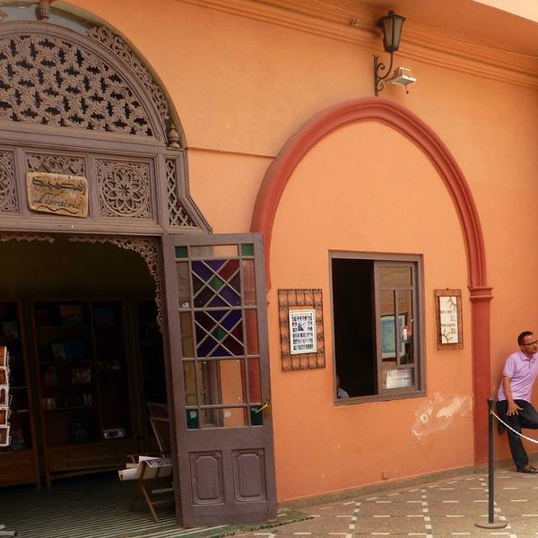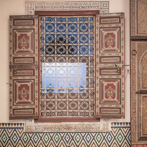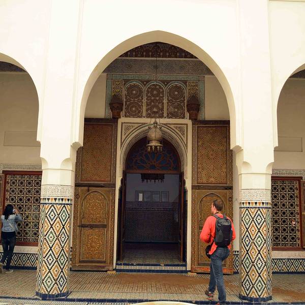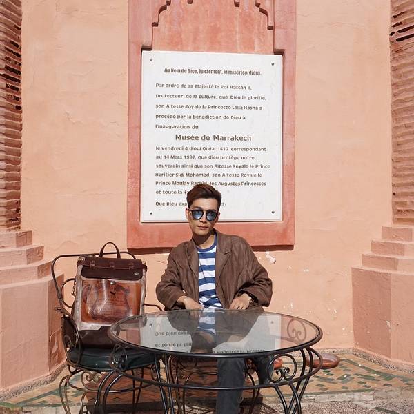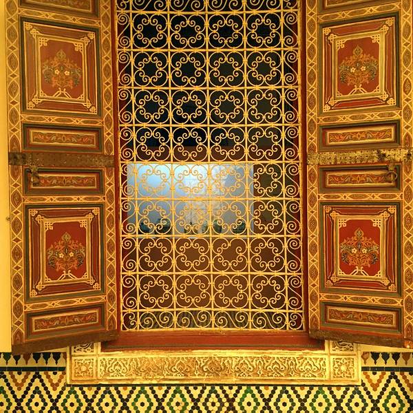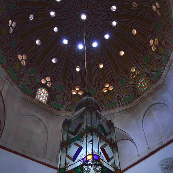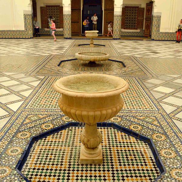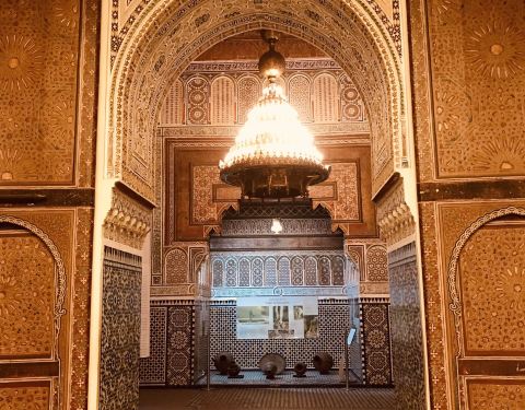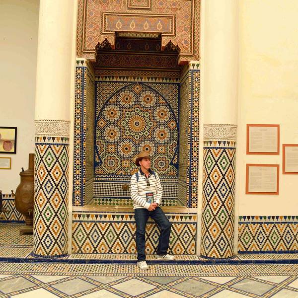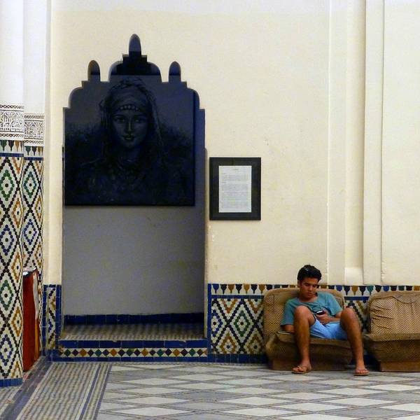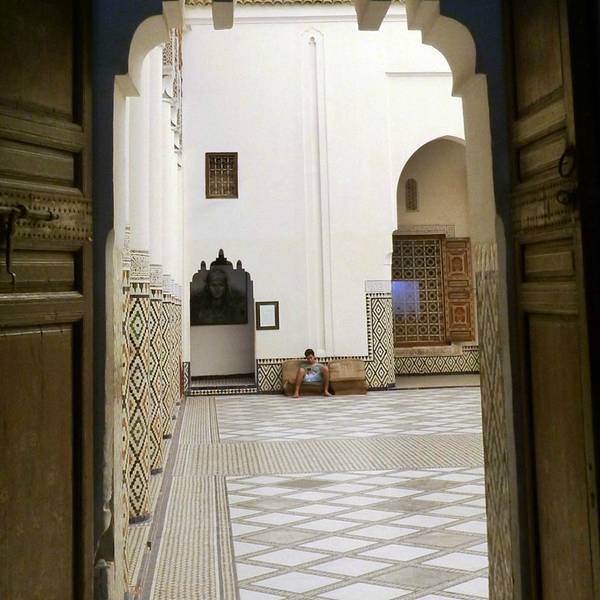 马拉喀什博物馆Museum of Marrakesh的院子外墙砖红色,外面有明显标示,当地人都知道MUSEUM,很容易找到。博物馆是一个阿拉伯式庭院,四周粗大的雕花柱子,地面大理石的花纹雅致精细,大型的水池是这种庭院的的标配。导游说,一般正房是诵经场所,外面是供信徒清洗的水池,现在干燥状态。正中大型吊灯很吸引眼球,巨大的灯罩是金属丝编就。十分精致。内部四周布满石雕和木雕,几何图案,对称细密。博物馆没有很多展品,有一些历史照片和物件,精美建筑的布局和美轮美奂的装饰也是历史的一部分吧。这个古老的庭院正在举办一个现代艺术展览,有的展品和画作很现代,这倒给这间古老的大宅增添了生动活波的气氛。博物馆院子里有露天咖啡厅,但是到我们离开时已近中午还没有开门。院子里一个小商店,陈列的明信片上可以看到最完美的马拉喀什的美景,我们跟着画面又游览了一遍主要景点,真可谓穿越千年,回到了中世纪。门票每人50MAD (1RMB=1.46MAD)。网上有关套票的信息,经询问售票处,被告知已经不再实行。门外有人要当导游或者兜售一天游的包车,马拉喀什不大,步行或打的去主要景点非常方便。摩洛哥导游须持执照,打击黑导游。