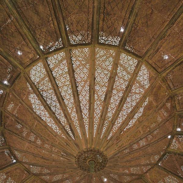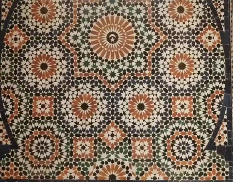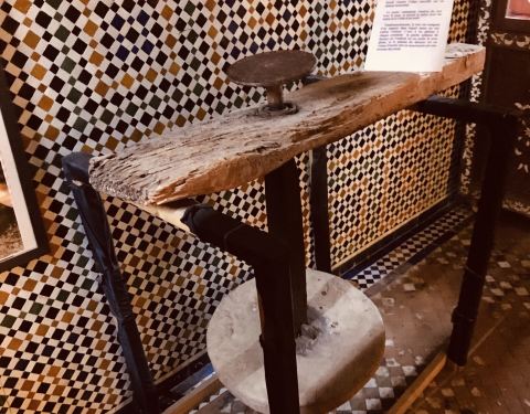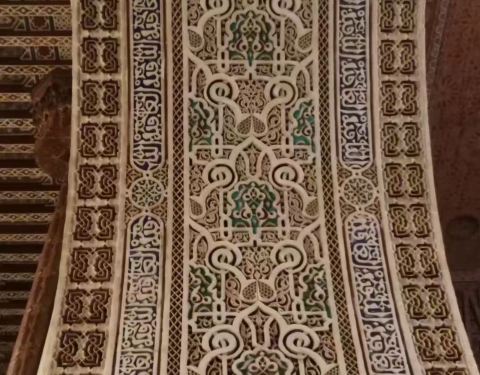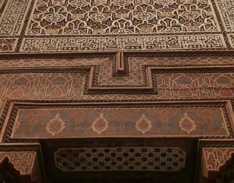 博物馆是一个阿拉伯式庭院,四周粗大的雕花柱子,地面 大理 石的花纹雅致精细,大型的水池是这种庭院的的标配。导游说,一般正房是诵经场所,外面是供信徒清洗的水池,现在干燥状态。正中大型吊灯很吸引眼球,巨大的灯罩是金属丝编就。十分精致。内部四周布满石雕和木雕,几何图案,对称细密。博物馆没有很多展品,有一些照片和物件。
