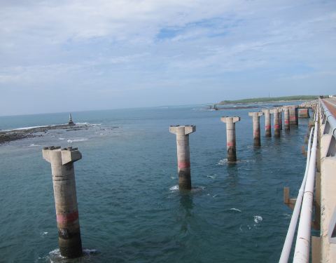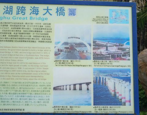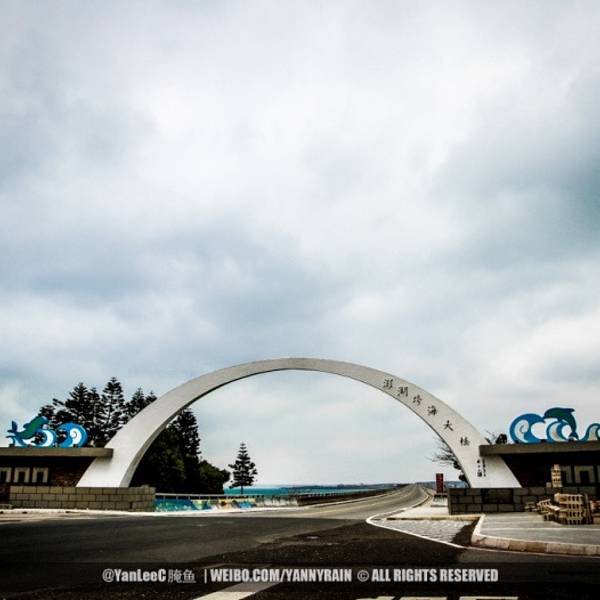 这里风景非常漂亮,可惜这次台湾行程就没有碰好天气,气死人的是,我们刚离开澎湖,澎湖就是蓝天白云了澎湖跨海大桥全长共计2,494公尺,横跨白沙、西屿两岛之间的吼门水道,水流湍急,流速据说可达每秒3公尺,为澎湖海域第二险流。每当冬季东北季风来临,更是怒涛汹涌,难以行船,因此,1965年始建跨海大桥,1970年...澎湖跨海大桥全长共计2,494公尺,横跨白沙、西屿两岛之间的吼门水道,水流湍急,流速据说可达每秒3公尺,为澎湖海域第二险流。每当冬季东北季风来临,更是怒涛汹涌,难以行船,因此,1965年始建跨海大桥,1970年完工通车,以解决渔翁岛往来的交通困境。尔后,因桥梁腐蚀严重与桥梁坍蹋,于1984年拓宽陆堤,1996年完工通车成为双车道新桥。远望如海上长虹不但具观光价值,也让西屿和白沙两地交通畅流无阻。至今大桥西屿端北侧海域仍留有早期水泥柱和框架,靠西屿一侧留有斑驳的桥墩,分别说明早期西屿电力是由高压电线架跨海输送,与旧桥功成身退的一段沧桑史。