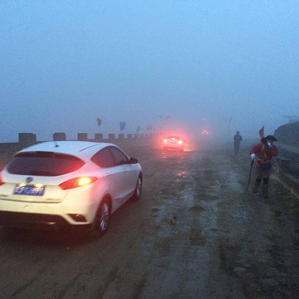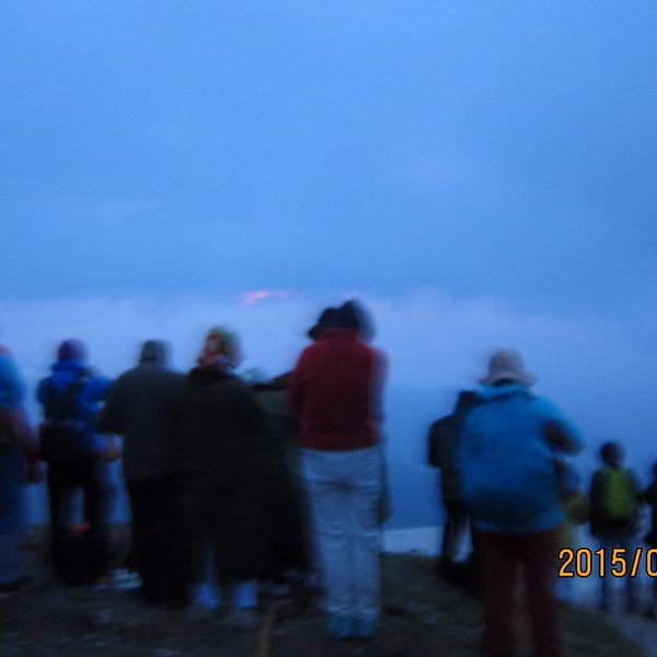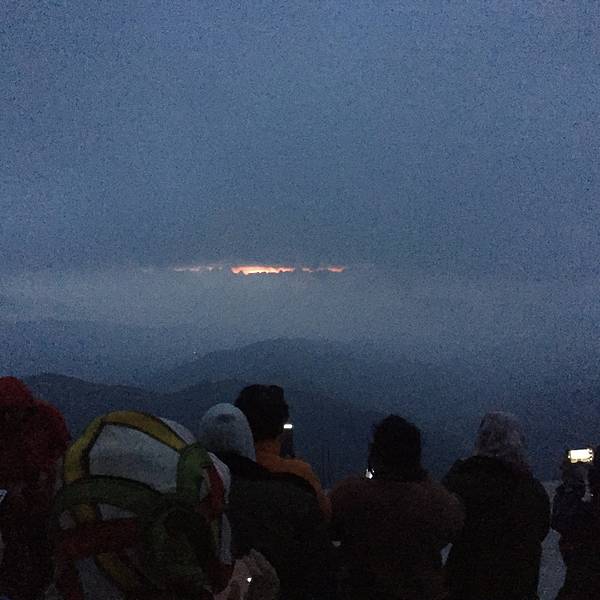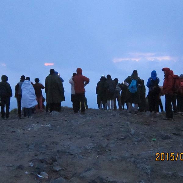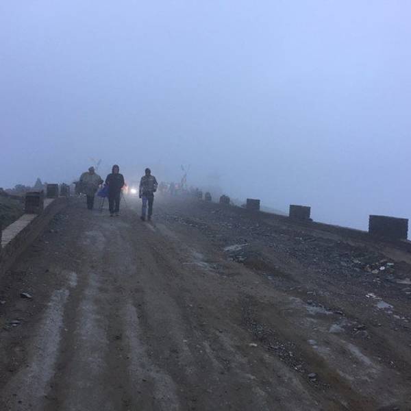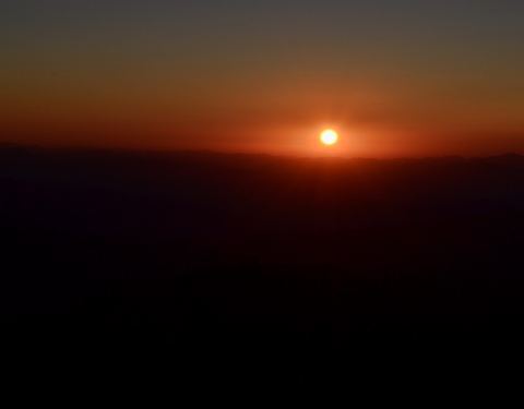 在这里日出的壮观不够热烈,但已经宏大的展现出来,地方火线美景。日出时间,大家静等云彩飘过,把藏在后面的太阳露出来,人群不时地欢呼说明看见日出了。一些汽车沿途上山,在夜里大灯闪烁,尘土飞扬,非常不好,我们徒步的只好包裹的严实些,喝着尘土前进。