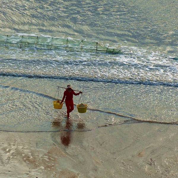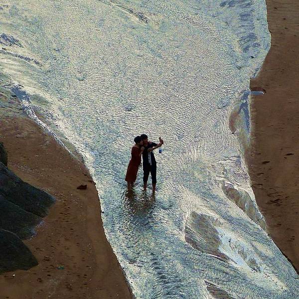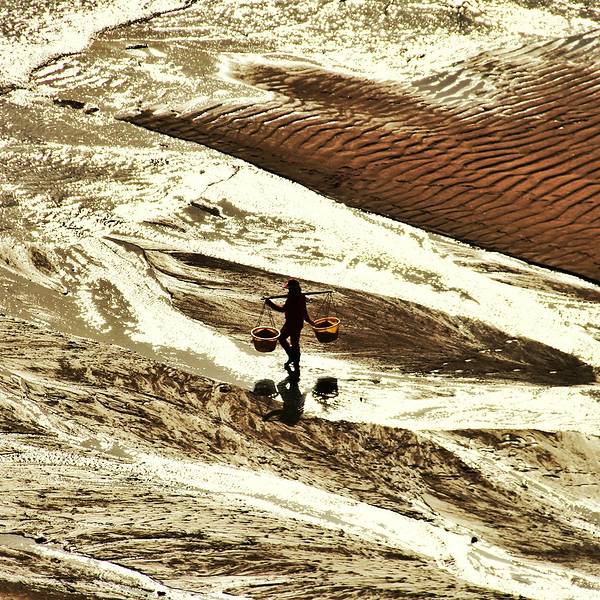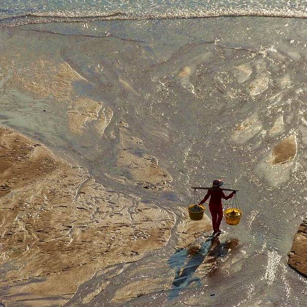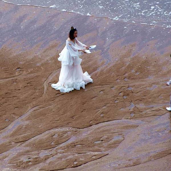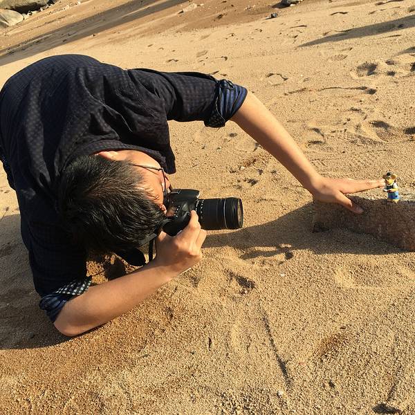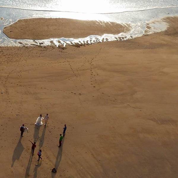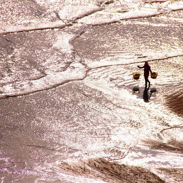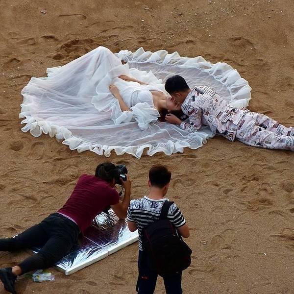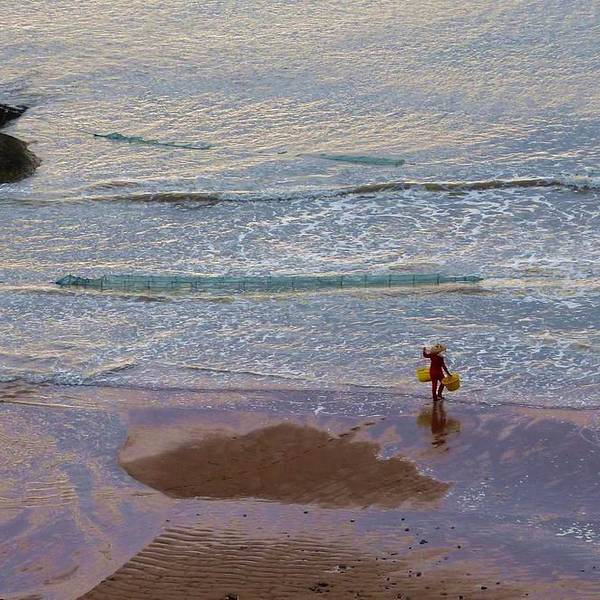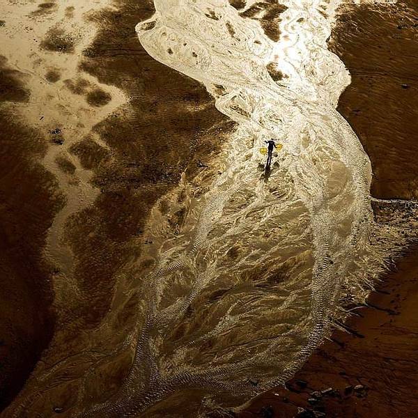 于是,伴随着太阳一点点开始下落,大概在4点钟前后,潮水临近涨上来的时候,这张照片诞生了!金黄的光芒映着人影,很漂亮,也很有视觉冲击力。