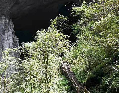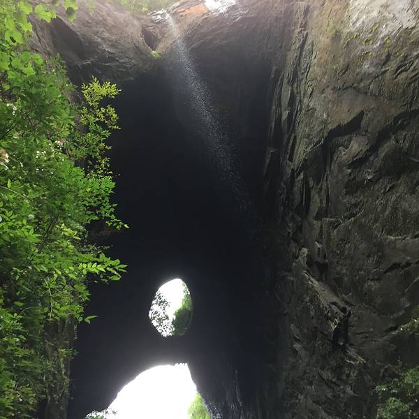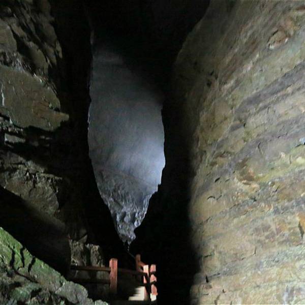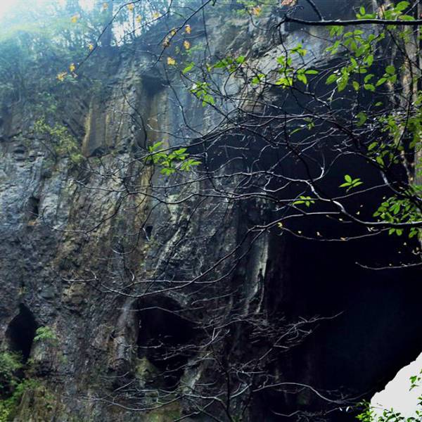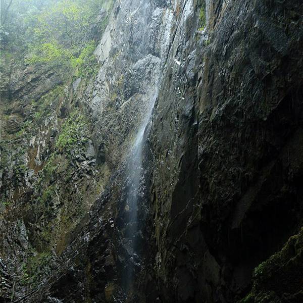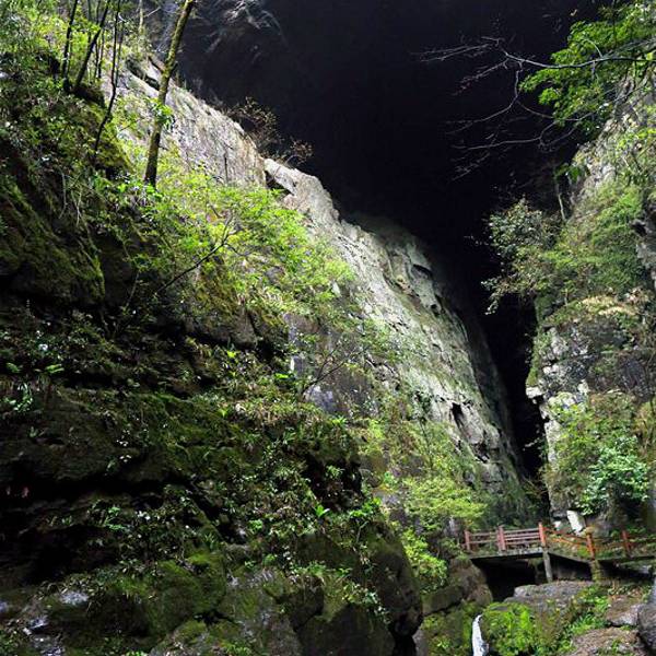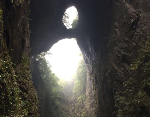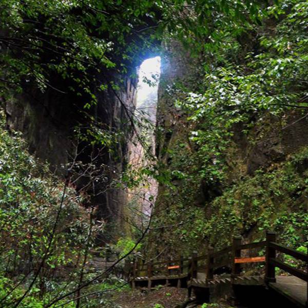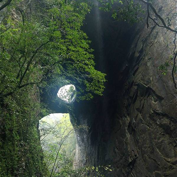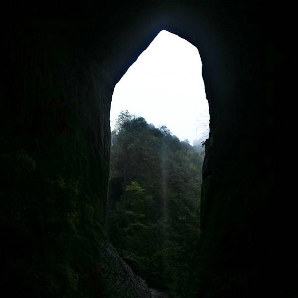 吃了游鸡公山的“苦”,我们游兴顿减,好在此时雨停了。我们接着来到了四洞峡。顾名思义,四洞峡就是四个洞连起来的峡谷。这几天我们已经在这里看了太多的洞,什么旱洞,水洞,还有刚看完的最大的腾龙洞,所以对这个洞我们就没有什么好奇了。可是一走进峡谷,我们就发现这里的树木要比鸡公山的树丛更加茂盛,加上峡谷幽深,溪流潺潺,谷中水汽充沛,石上布满苔藓,林木都是青翠欲滴,雨后的空气又格外清新,让人感觉就是到了一个天然氧吧。比较起来,我们觉得这里更有原始风貌的味道。游览的路线也设计得很好,实际上这里海拔不是很高,平均1200到1400米左右,但这种由上至下的线路还是让人游起来更加轻松愉快。最让我们惊喜的还是这个四洞,准确说应该是五洞,因为第一个洞就有上下两个洞口,这几个洞从一条长约2000米峡谷的四座大山的山体中贯穿而过,形成罕见的自然奇观,是一种极为少见的穿洞群落地质景观。难得的是这几个洞各有特色,有旱洞也有水洞,有岩溶洞穴也有洞内暗河,有洞厅也有迷宫。洞内外随处可以见到大小不一的瀑布,有的高挂洞壁,飞流直下;有的则从高空飘洒而下,似帘似雾。更叫绝的是有的洞顶还开着浑然天成的“天窗”,使天坑与穿洞连为一体。总之是各各有神奇,洞洞都精彩,是我们看过的溶洞中最有特点的一个。