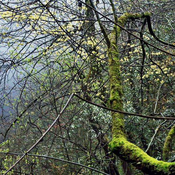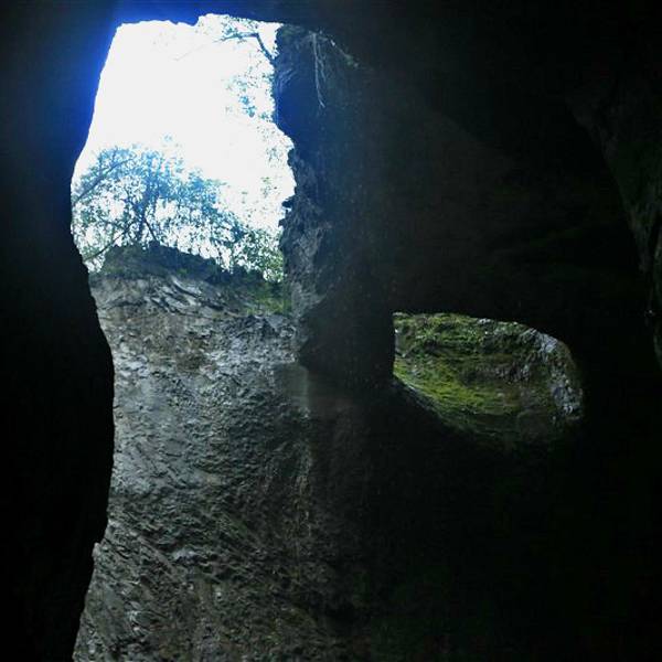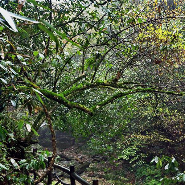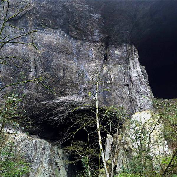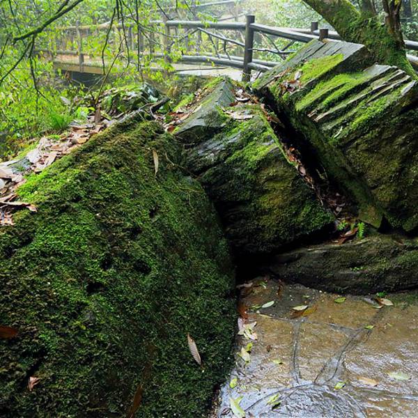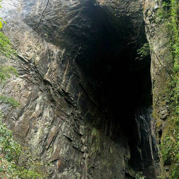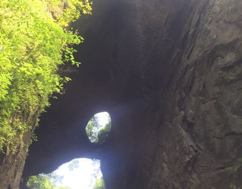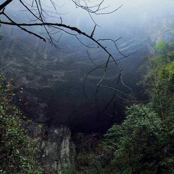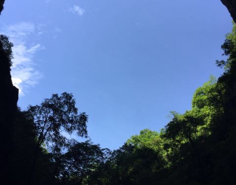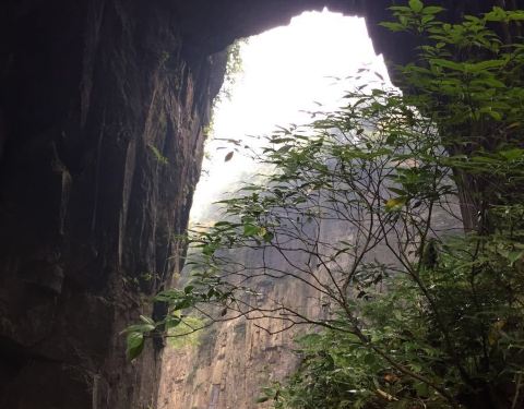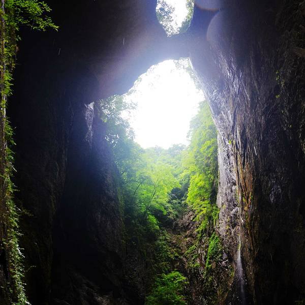 吃了游鸡公山的“苦”,我们游兴顿减,好在此时雨停了。我们接着来到了四洞峡。顾名思义,四洞峡就是四个洞连起来的峡谷。这几天我们已经在这里看了太多的洞,什么旱洞,水洞,还有刚看完的最大的腾龙洞,所以对这个洞我们就没有什么好奇了。可是一走进峡谷,我们就发现这里的树木要比鸡公山的树丛更加茂盛,加上峡谷幽深,溪流潺潺,谷中水汽充沛,石上布满苔藓,林木都是青翠欲滴,雨后的空气又格外清新,让人感觉就是到了一个天然氧吧。比较起来,我们觉得这里更有原始风貌的味道。游览的路线也设计得很好,实际上这里海拔不是很高,平均1200到1400米左右,但这种由上至下的线路还是让人游起来更加轻松愉快。最让我们惊喜的还是这个四洞,准确说应该是五洞,因为第一个洞就有上下两个洞口,这几个洞从一条长约2000米峡谷的四座大山的山体中贯穿而过,形成罕见的自然奇观,是一种极为少见的穿洞群落地质景观。难得的是这几个洞各有特色,有旱洞也有水洞,有岩溶洞穴也有洞内暗河,有洞厅也有迷宫。洞内外随处可以见到大小不一的瀑布,有的高挂洞壁,飞流直下;有的则从高空飘洒而下,似帘似雾。更叫绝的是有的洞顶还开着浑然天成的“天窗”,使天坑与穿洞连为一体。总之是各各有神奇,洞洞都精彩,是我们看过的溶洞中最有特点的一个。