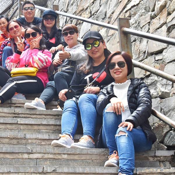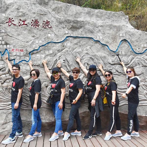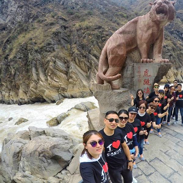 蓝天白云下我们速速往最下面的观景台进发,途中留下一张张合影--下到最下面的虎跳峡观景台,大家统一穿上了团服拍下集体照--当期水流并不大所以看上去并没有显得非常湍急-- 展开