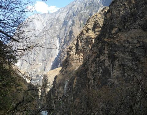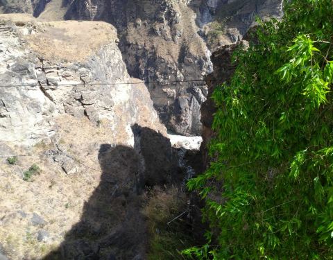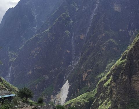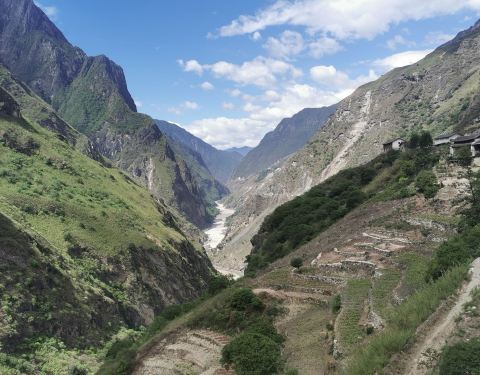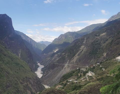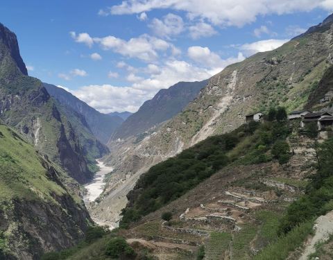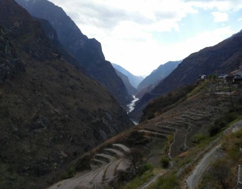 驱车过上虎跳景区继续向前行驶,穿过一个隧道,路边有标牌提示,前方的道路多有塌方和裂隙,游客自负安全。行驶二十分钟左右便可抵达中虎跳景区。这个景区不算正式景区,一个小村子,无人管理。游客自已走小路下到谷底再爬上来,来回得两个小时。上来的路上还要攀爬一段绳梯。上下的路都要交买路钱,有人把守收费,下收15元,上收10元,说是路是他家修的。对此感觉不好,就没有下去,在周边拍了一些照片,景色还是不错的。另外村里有家农家乐,菜做得不错,菜都是自家种的,无污染,吃起来很新鲜。