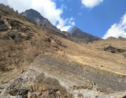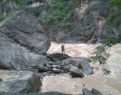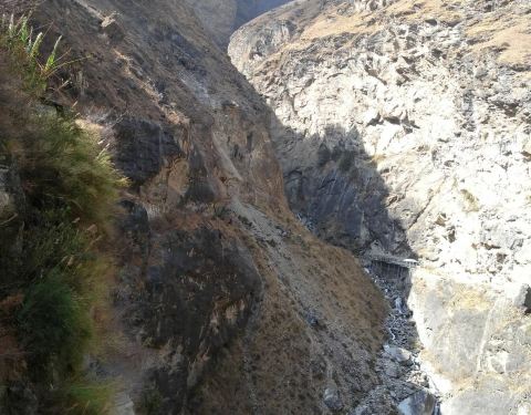 中虎跳需要沿着狭窄的山路步行下去,建议穿防滑的登山鞋,这里砂石比较多,地下也比较滑