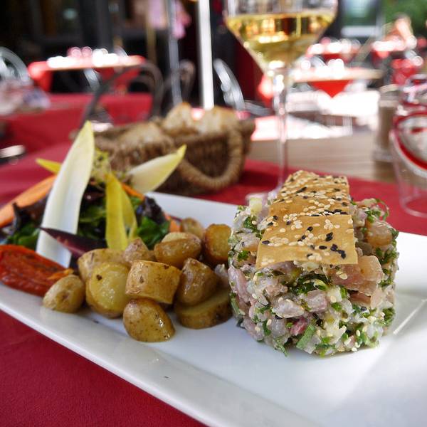 我按着tripadvisor的推荐,选择了这家性价比很高的Le Muratore (在Rue Nationale和Place Jean Bernax)的交界处,红色的招牌,很好找。这家夫妻老婆店,服务很热情。菜单也有英文的。我选择的是Chef’s recommendation的一道鱼料理,主菜是Fillet Tarta (莱蒙湖的鱼生料理)+色拉+烤小土豆,配了他们家的house whitewine,非常完美的一餐,值得推荐。