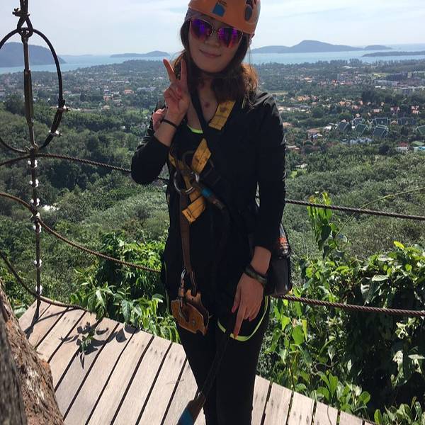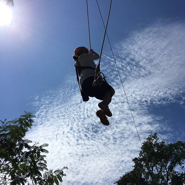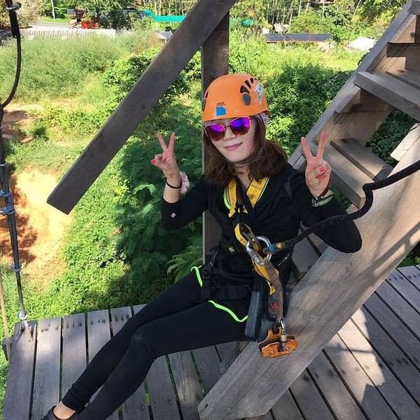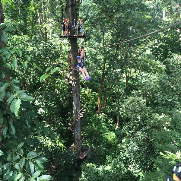 这个是最高一个平台上教练给我们拍的,四个人的感觉还是不错的。发现玩这个的普遍女生的胆子都是大于男生的因为之前清迈的丛林飞跃出了事情,所以还是有些犹豫的。想想当时是把自己逼上了梁山,原来不想第一个,结果教练直接让我首当其冲~~宣传片一样的照片,教练还是很会拍照的,拍了同伴的手机电量和流量消耗的不是一...因为之前清迈的丛林飞跃出了事情,所以还是有些犹豫的。想想当时是把自己逼上了梁山,原来不想第一个,结果教练直接让我首当其冲~~宣传片一样的照片,教练还是很会拍照的,拍了同伴的手机电量和流量消耗的不是一般的大。这个是最高一个平台上教练给我们拍的,四个人的感觉还是不错的。不过丛林飞跃千万记住:再害怕不要拿手扶着上面的滚轴,我就是过来人,脱手之后害怕就直接抓住了上面的滚轴,结果快到滚轴来回滚,差点手就没有了。还好速度慢下来了,还好就指甲油蹭掉了点,整个手都麻木了。发现玩这个的普遍女生的胆子都是大于男生的。当时在清迈我要和老公去玩这个,我老公就百般不愿意,说让我一个人去,汗~~~这次终于如愿了。这次除了我们四个女生之外,还有一对外国友人,外国友人中的女生也比较放得开,男生的话教练一直叫男生张开双臂,可是一直张开了一半就不张开,那个动作还是蛮搞笑的。这个项目看来比较受女生的热捧。。。