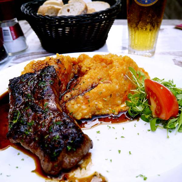 这家常年招待各国游客,所以有英文菜单,价格也不贵(主菜在15-20欧)。传统的Stoemp (其实是胡萝卜土豆泥,里面加了培根和洋葱末)配烤马肉,配清淡的比利时啤酒,非常可口(马肉和牛排差不多,不过五分熟Medium,已经感觉略老,以后去的朋友可以考虑三分熟Medium Rare。
