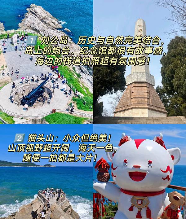 1️⃣ 刘公岛:历史与自然完美结合,岛上的炮台、纪念馆都很有故事感,海边的栈道拍照超有氛围感!