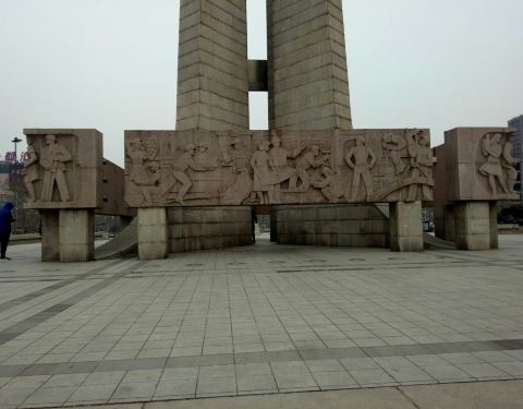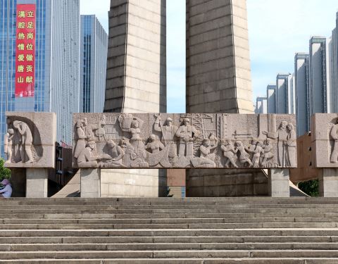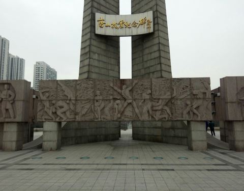 唐山抗震纪念碑广场位于市中心,北侧是百货大楼,西侧是万达广场。纪念碑高 33米,由4根碑柱组成,外围由8 幅浮雕组成,象征着人定胜天和全国四面八方的支援。纪念碑的西边就是抗震纪念馆。