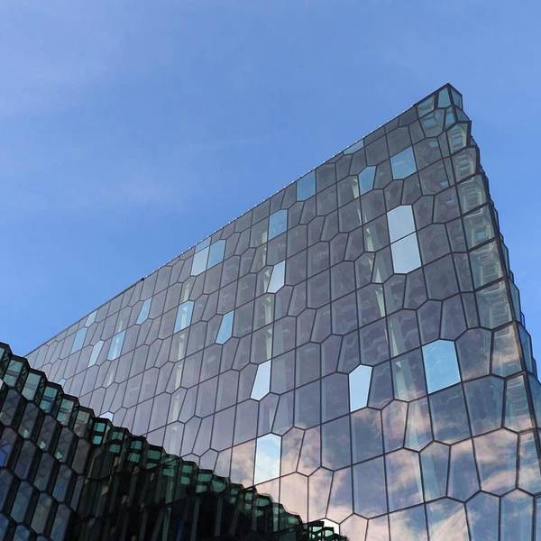 现代新潮,彩玻璃墙的设计很出彩,特别是当外面的阳光洒进来的时候。蓝天之下的Harpa外景现代新潮,彩玻璃墙的设计很出彩,特别是当外面的阳光洒进来的时候