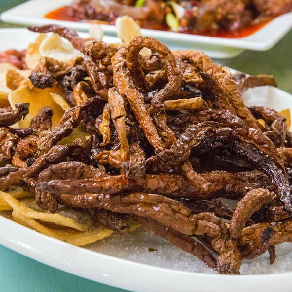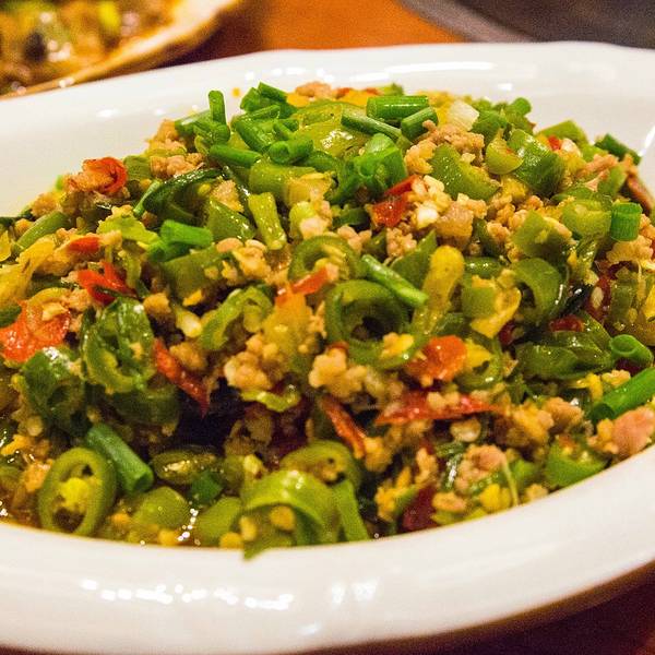 - 油炸过的辣椒,刚开始不敢吃,看着大家吃了都说一点都不辣,于是尝了尝,果然,适合当饭后的下酒小吃
