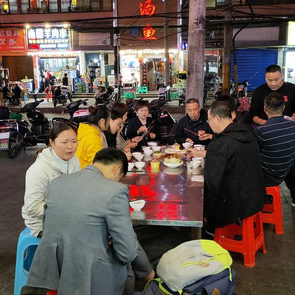 - 著名的贵州小吃摊档琳琅满目,最后我们坐进了一家海鲜摊档。灯火繁华,食客云集,热闹非凡