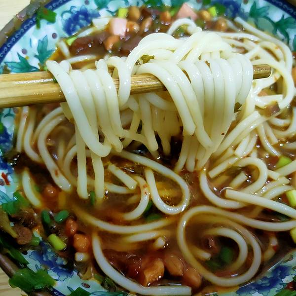 面是灰色的,像是荞麦做的,比较细,但是很有嚼劲。这是在贵阳以来吃过最辣的了,喝口皇茶压压~花溪牛肉粉,据说牛肉是按片算钱的。