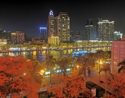 ...,珠江夜景从黄沙白天鹅宾馆开始,一直向东到达海心沙广州塔,全长十几公里,两岸的灯光闪烁,非常美