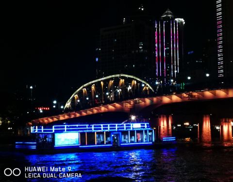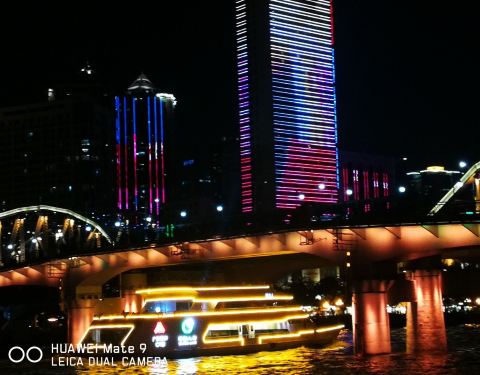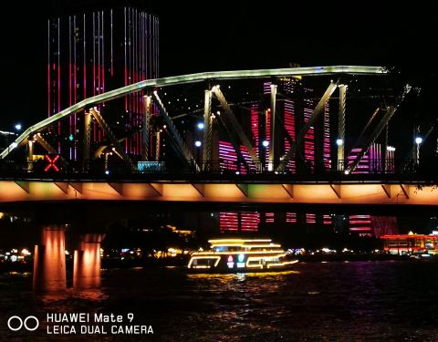 现在的珠江夜景已经是来广州游的必定项目了,珠江夜景从黄沙白天鹅宾馆开始,一直向东到达海心沙广州塔,全长十几公里,两岸的灯光闪烁,非常美。照片里第一条桥是解放桥,远处的才是海珠桥。