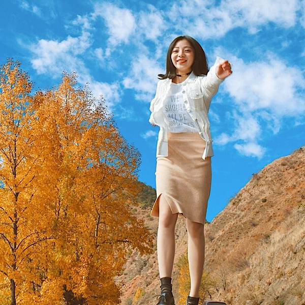 车子沿着湖边走,突然闯入两颗金黄满满的树,太美了途径泸源崖~拍一张游客照试试光,意外的是我超喜欢这张,因为有点像我的女神,哈哈哈泸源崖的景~挺美,但是不好拍~