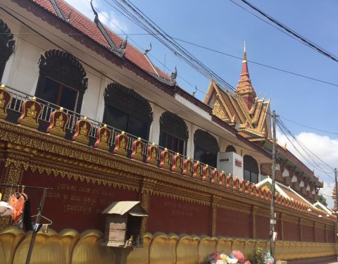 ...h Prom Rath的围墙,砖红色的围墙上写满了金色的经文,院墙上还装饰有许多佛像,非常好看买完明信片我们就沿着暹粒河向邮局进发。走几步路就能看到Wat Preah Prom Rath的围墙,砖红色的围墙上写满了金色的经文,院墙上还装饰有许多佛像,非常好看。