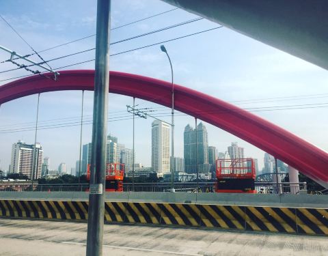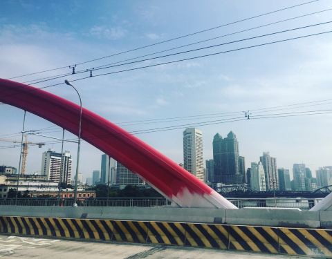 广州的解放桥历史很久啦,晚上灯光一亮,红色双拱门特别显眼~