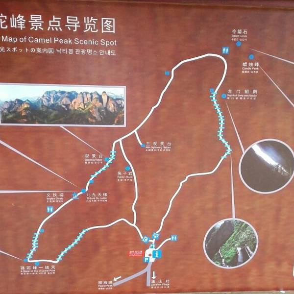 骆驼峰三面陡崖,峰顶高程 187.8 米 ,长 273 米 ,有两处凹陷,远望凹陷恰到好处地将石碑分成骆驼头、骆驼峰和骆驼尾,陡崖凹槽和起伏勾勒出骆驼肌肉,游人站在石田进口处的观驼亭,但见一匹头圆、峰耸、尾秃,错落有致,结构准确、分明,高耸于群峰之间,衬托远近青山,行走沙漠绿洲的大骆驼。