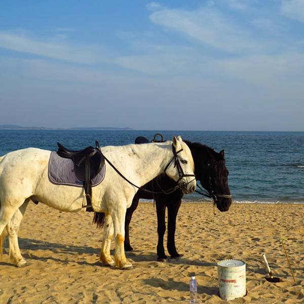 游玩:海滩边停靠有一辆很萌的大巴车和一架很小的飞机,作为拍照场景很是合适。另外沙滩边也可以骑马和坐沙滩摩托。海风合适的话也可以放风筝。到旅游旺季的时候,这一带还会有一些骑电动车出售椰子冰棒冰糖葫芦等的流动商贩。