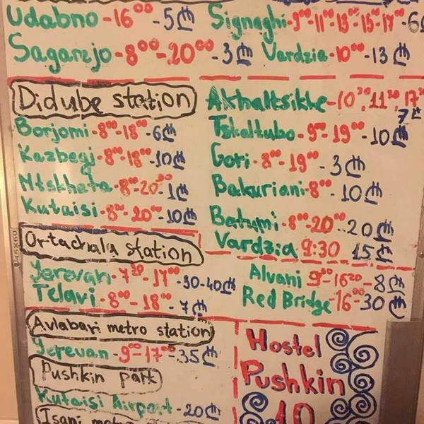 Liberty Square,广场不是很大,其实就一个雕像。自由广场周围漫步了一下,还是想着能找到,办电话卡的地方,不然导航什么的实在太不方便了。最终,结合着离线地图,和讯问警察叔叔,终于找到了Magticom运营商的营业厅,办了15 GEL的套餐,含有5000 MB的流量。还有一款套餐10 GEL,含有4000 MB的流量,但是还要卡费3 GEL,没有优惠多少,我就没有选择。离自由广场最近的Magti 营业厅,大概有750米左右,还算好找了,总比去小巷子里面随机摸索要靠谱很多。终于找到你营业厅9点就开门了,真是难得啊!在格鲁吉亚,感觉很难找到在10点以前开门的店铺,一般想在饭店吃早餐也得10点以后了。犹豫了一下,还是选择了15 GEL的套餐。有了电话卡,立刻用谷歌地图记录下这家Magti营业厅的地址办完电话卡就到旁边的饭店,随便吃了点儿。说实话,5 GEL在面包店也吃不出什么花样来,可惜要赶时间。如果不在酒店吃早餐,外面的早餐店开门真心很晚,都要9点半以后了,甚至10点。公共厕所基本上是收费0.5或者1 GEL,所以在饭店用餐的小伙伴们,不要忘了顺带排空自己的膀胱哦!坐地铁,要坐1:30左右的电梯,下去的时候还感觉不到速度很快,上来的时候才感觉到,原来电梯的速度还是挺快的。在第比利斯也能偶尔感觉到快节奏生活的人们匆忙的奔波在地铁站。地铁的新旧程度一般吧!没有电子屏报目的地,所以大家一定要注意听英语报站!英语不好的小好伙伴,记得打开谷歌导航看好站名哦!很喜欢这种的感觉。第比利斯的每个地铁站都有自己的风格,总有一款是你喜欢的。吃完早饭差不多十点半的样子,去地铁站办张地铁卡,准备去车站坐锡格纳吉的车。出了地铁也是经过几番折腾,才找到去锡格纳吉的车。去锡格纳吉的车和梅斯蒂亚挨着的,而且英文名是SIGENAGI,和我们所常见的Sighnaghi不一样。所以我也是再三跟司机确认是这辆车,然后就上了车。去锡格纳吉的首班车是9点,和之前查攻略说的11点有所出入,而且国内上说的很快就能发车。不知道是不是因为今天下雨的缘故,坐车人少,司机告诉我们一点钟才能发车。去锡格纳吉的车程大概一个半到两小时,最晚回来的车是下午6点,综合考虑了一下,时间确实来不及,索性就放弃好了。真的特别不舍得放弃这个小镇,因为这次的主要是红酒之旅。因为时间也晚了,包车的话当天往返时间也已经不是很充裕了,看看后面还有没有机会吧。我真是高估了格鲁吉亚的公共交通了,之前看了一篇攻略说的撤销人多,我就以为去锡格纳吉的车是随到随满,一会就能发车的。没想到,后来看到一篇攻略上的一张发车时间表才知道,去锡格纳吉的车都是定时定点发车的,而且间隔都得2个小时。请大家认准这张时刻表,除了第比利斯前往锡格纳吉的末班车好像是18:30以外,其它信息都算听准确的。锡格纳吉真是让人又爱又恨的地方,想去锡格纳吉很难,想从锡格纳吉回来也很难。既然车站周围偶遇菜市场,就溜达一下。这儿的豆角居然有又长又扁的品种比较酸的奶酪,是格鲁吉亚人早餐的日常配料。这种番茄不知道口感如何?去不了锡格纳吉,就来个第比利斯一日游好了。准备前往圣三一大教堂。 展开