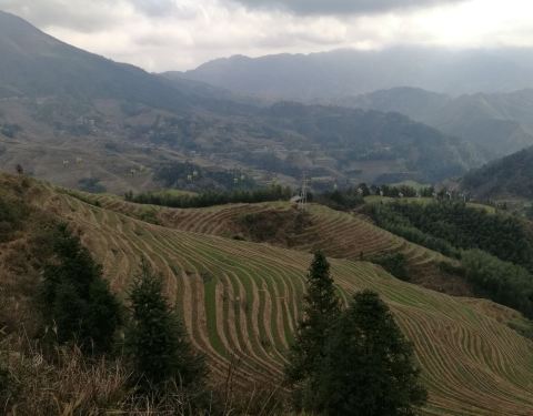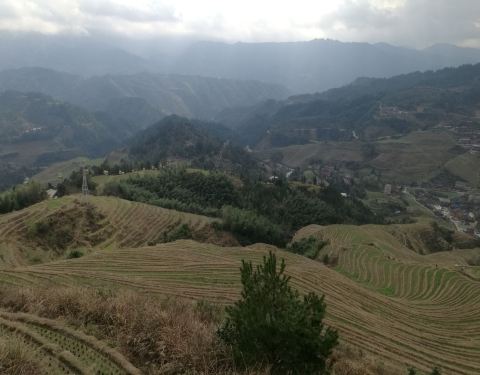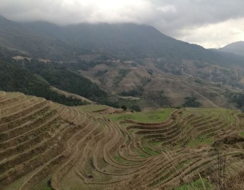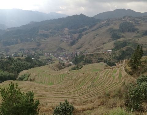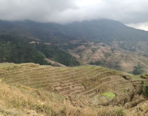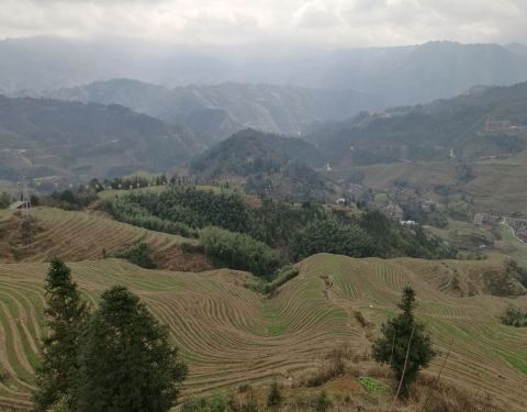 在广西壮族自治区的桂林市北部的龙胜县的龙脊乡,有当地壮瑶少数民族创造的梯田,广西省山多田少,有八山一水一分田之说,这种梯田在高坡度地上保持了水土。