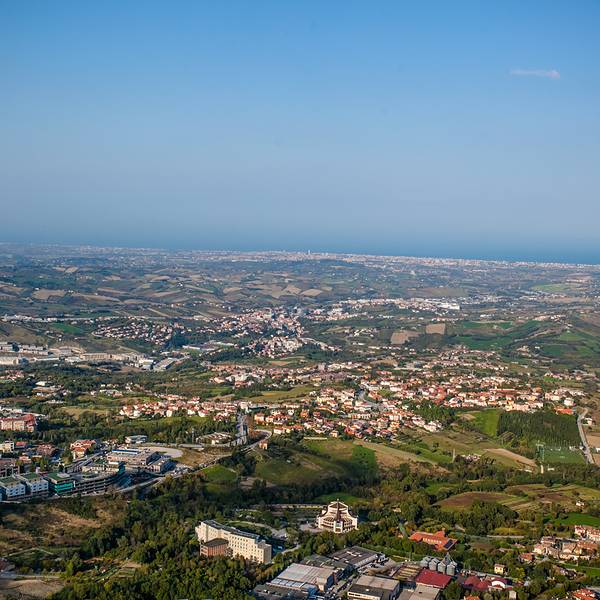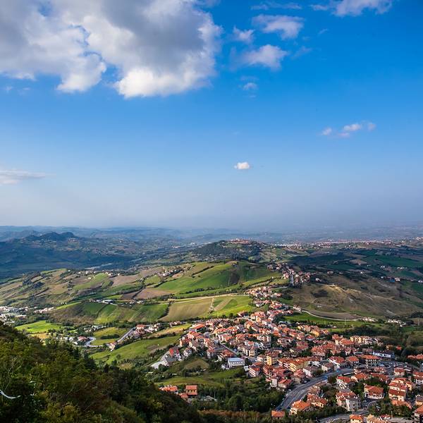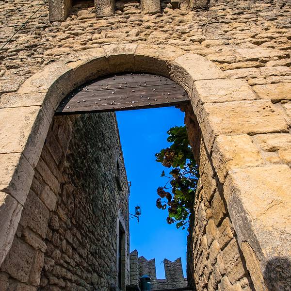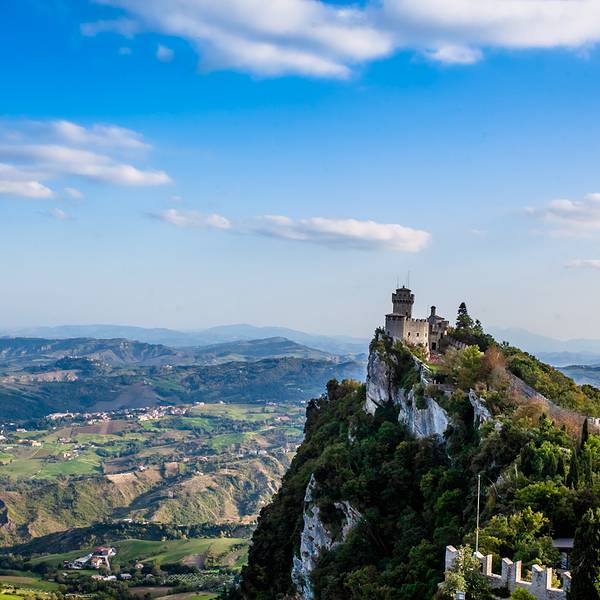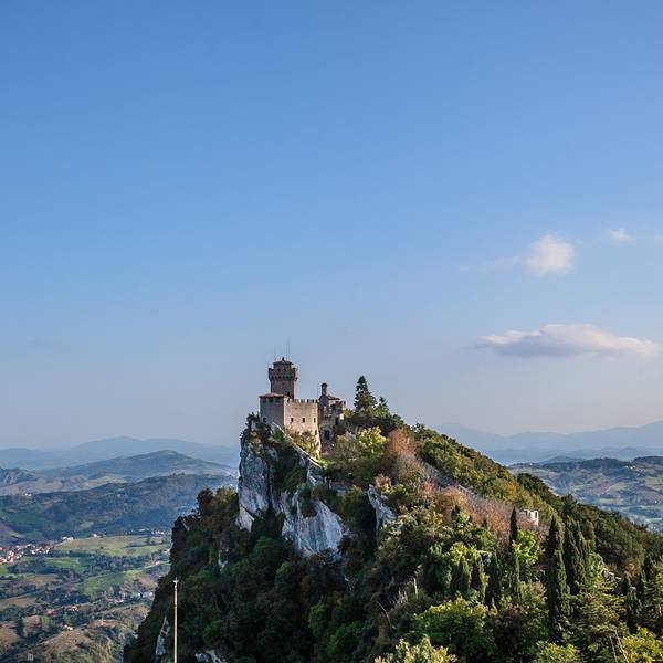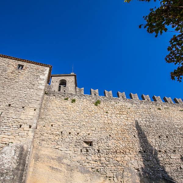 圣马利诺的国徽是三座山棱上的高塔,也是三座防御工事,其中之一就是第一碉堡(Prima Torre) ,也称古阿意塔城堡(Castello della Guaita) 。第一碉堡的历史可回溯至公元10 世纪,是中世纪遗留下来的老建筑。五角型的基底紧紧盘踞在岩石上,坚实的双层城墙是战时绝佳的避难场所;碉堡内部分空间曾为监狱。碉堡庭院里有两门二战遗留下来的迫击炮与加农炮,后者在共和国重要节日时施放庆祝。第一碉堡位于海拔738 公尺,登高望远,360 度开阔视角远眺山海美景,配上老建筑,彷佛回到古时悠闲自在的乡村时光。