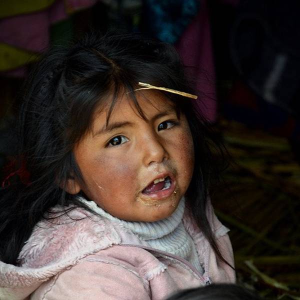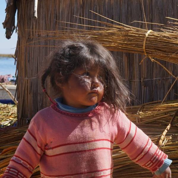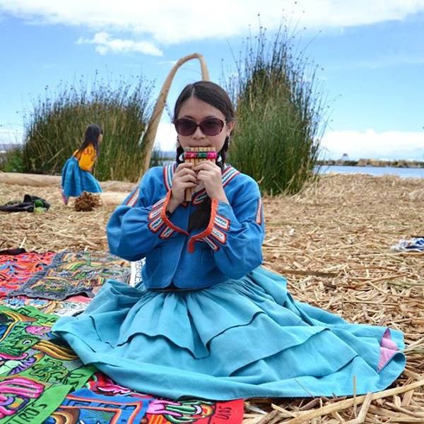 普诺最有意思的地方在于湖上漂着的几个漂浮岛,其中最有名的一个岛叫Uros。这些漂浮岛都是有一种叫Totora的挺水植物堆成的(虽然Totora的中文翻译是高香蒲,但是其实和中国的香蒲并没有什么关系),这种植物,在新鲜的时候可以吃(我好奇尝了一下还挺清新的),发烧的时候可以敷额头,干了以后可以当建材,不但这些岛的基底是用totora铺成,就连岛上的房屋和船都是它做的,着实有趣。上岛以后可以到各个岛民家里参观,然后穿他们的衣服拍照,不穿不知道,一穿才发现原来我好瘦,裙子基本是我腰围的两倍啊……也是不懂当地人每天就吃吃香蒲和鳟鱼怎么会变得那么胖。当地人给我的印象,除了胖和脏以外,主要就是对艺术的热爱了,这里妇女的日常基本就是做工艺品,而男人基本就是建筑和撑船。岛上有个小朋友特别喜欢我的排箫,于是时不时要问我借了吹,最后我就把它送给那个小朋友了,也算做了件好事~~(好吧我不否认我是有点嫌弃)有的小朋友五官真的很漂亮。可惜就是太脏了。
