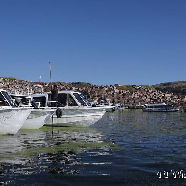 早上5:30到达Puno,被旅行社的人接到宾馆。洗漱后,睡一觉,等到八点,旅行车前来接送,到Uros的码头。