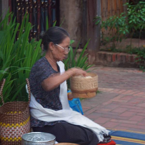 晨间布施——琅勃拉邦的经典时刻琅勃拉邦人信奉上座部佛教,每天早晨,城中大小寺院的僧侣们会排着有序的队伍在长老、住持的带领下接受每天一次的布施。信仰虔诚的老挝人会在路边铺上一块席子,跪坐在上面,静静地等待橙衣僧侣们的到来。琅勃拉邦一般人布施的都是糯米饭团,僧侣经过时信众会在每一个僧侣的钵盂里放上一小团糯米饭,整个布施过程非常安静肃穆,只有眼神和心灵的交流,从不受外界的干扰。琅勃拉邦各寺庙中僧人们的一日两餐都来源于每天的这次布施。