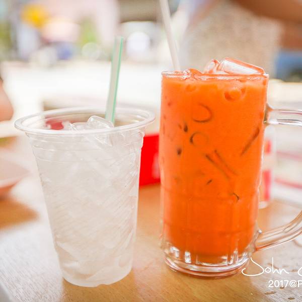 桌上放着生的葱、蒜、辣椒, 泰国 人都是生嚼的,其实我也蛮喜欢的,但没好意思入乡随俗哈哈哈~饮料点了泰式奶茶,啊~果然~还是那么甜啊。。。果断抢了某人的冰可乐!价格十分便宜,环境的话室内还可以,室外苍蝇比较多,介意的小伙伴慎选~