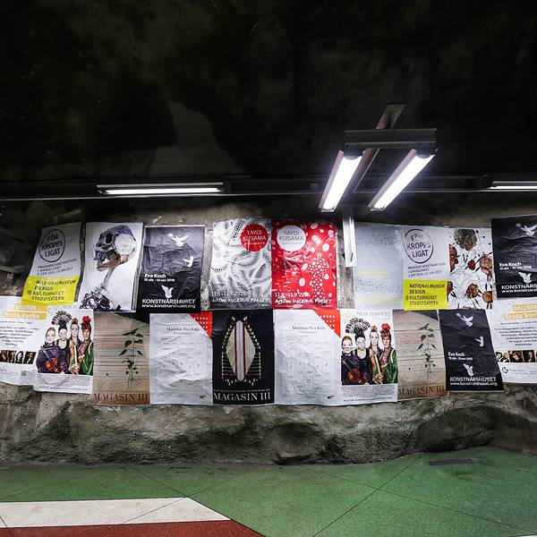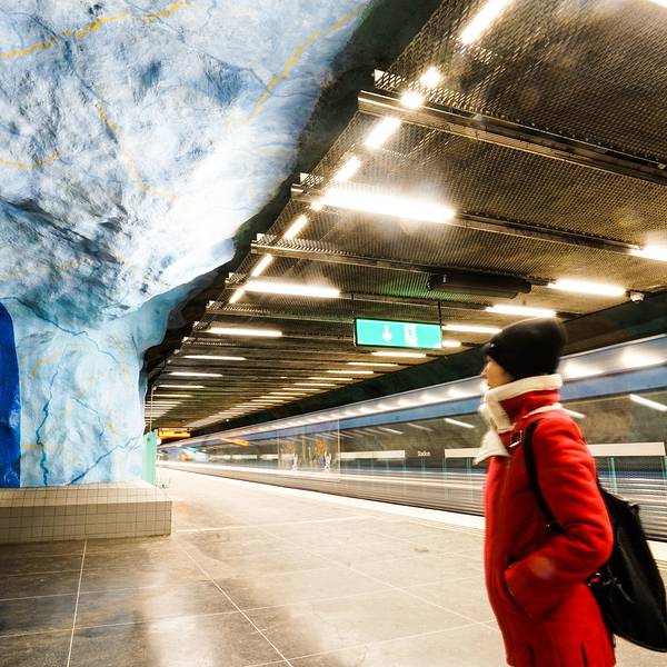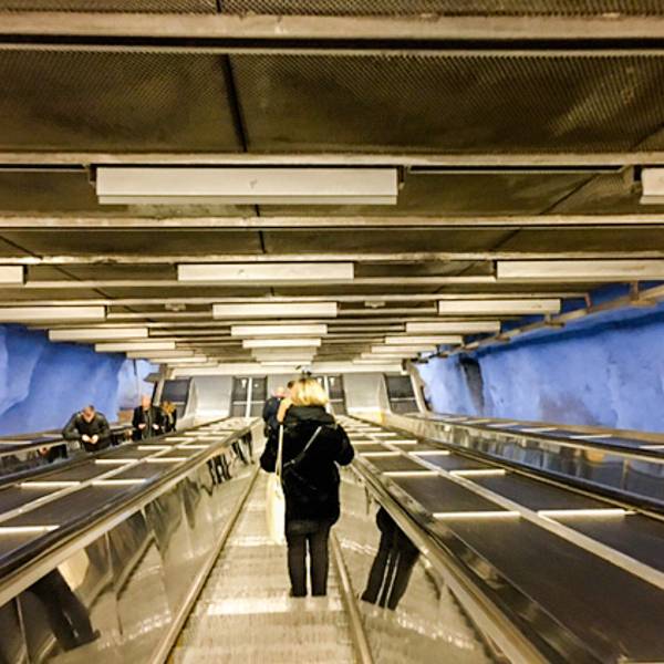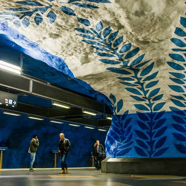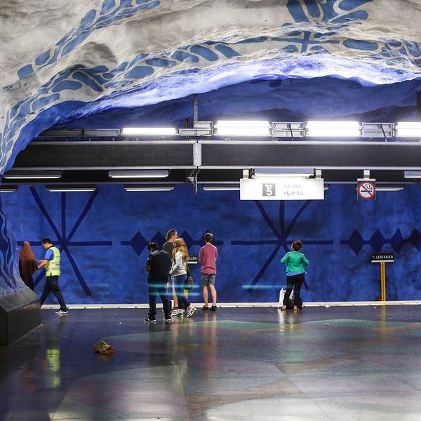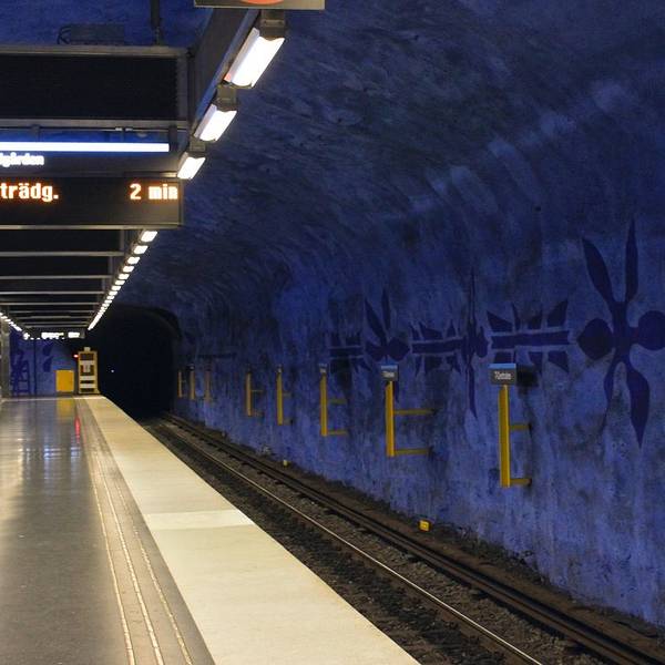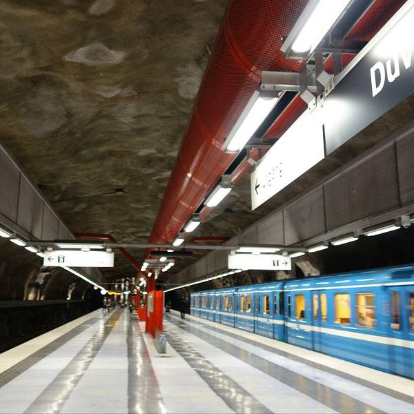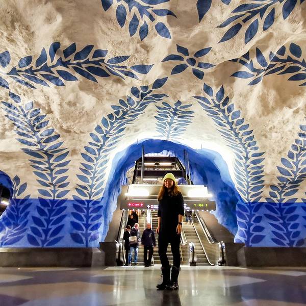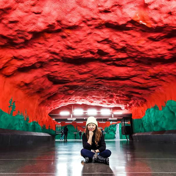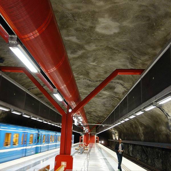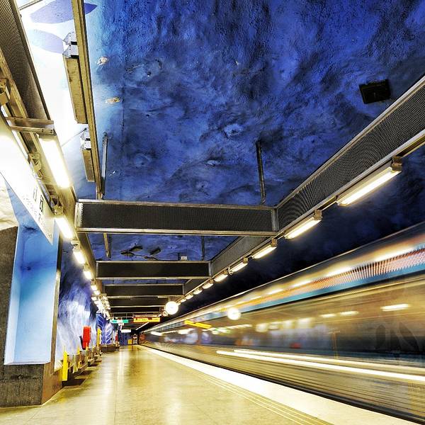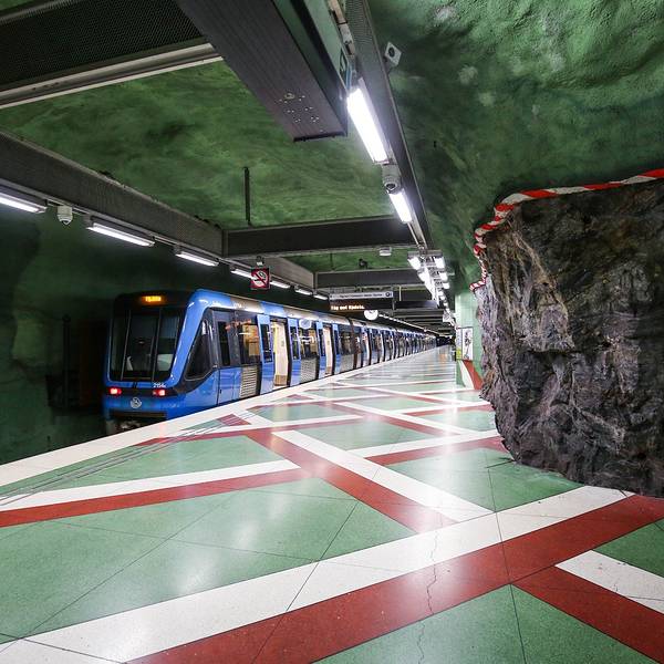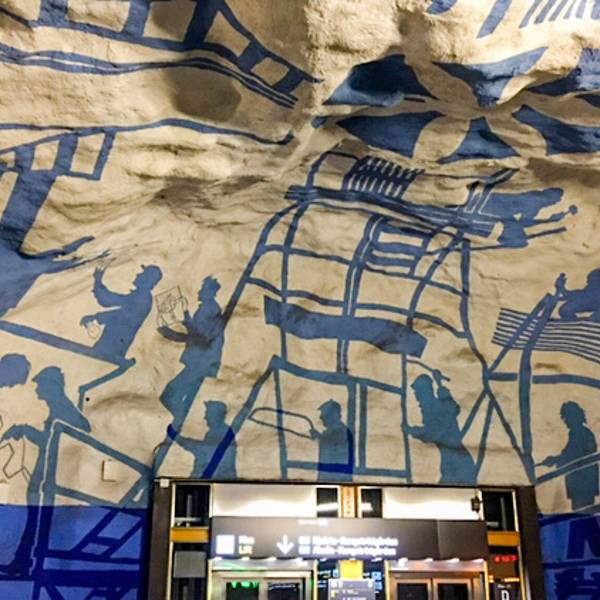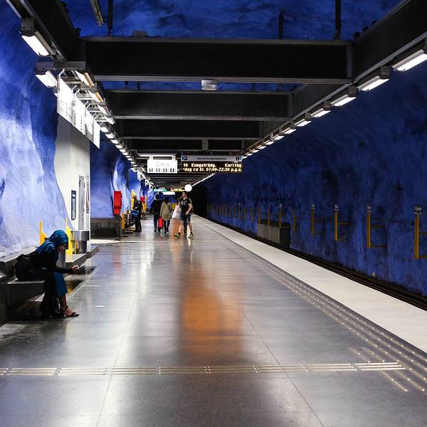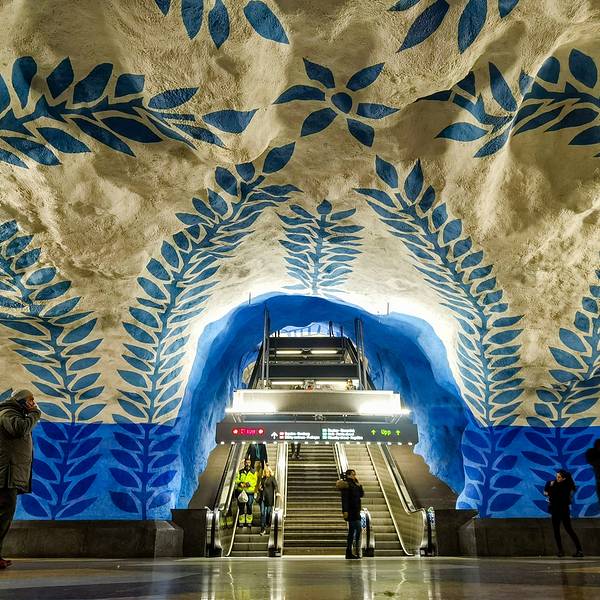 斯德哥尔摩地铁有“世界最长的艺术馆”美誉,一站一风景,可以说地铁站是斯德哥尔摩的名片。众多游客为其大胆而独特的设计所倾倒。如果时间不多,那么推荐沿蓝线,从终点站国王花园(Kungsträdgården)开始,依次驶过布满巨型蓝色树叶的中央火车站(T-Centralen)、褐色的市政厅站(Rådhuset)和大红的索尔纳中心站(Solna Centrum)。