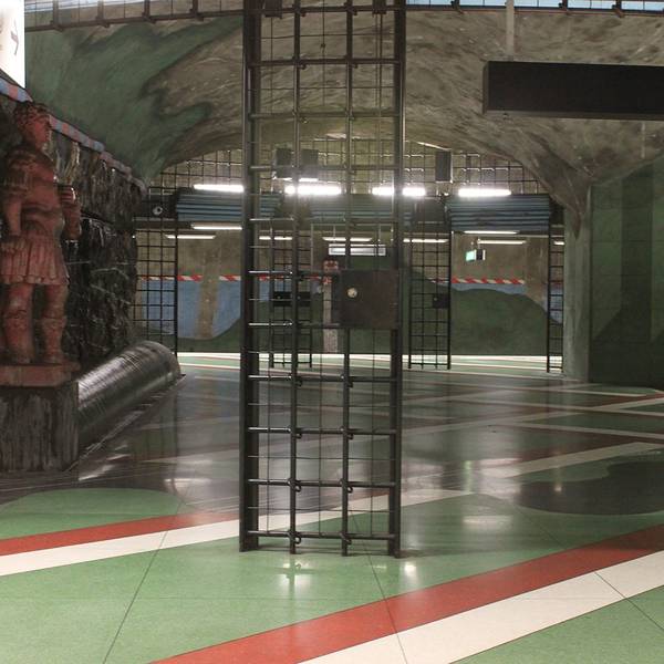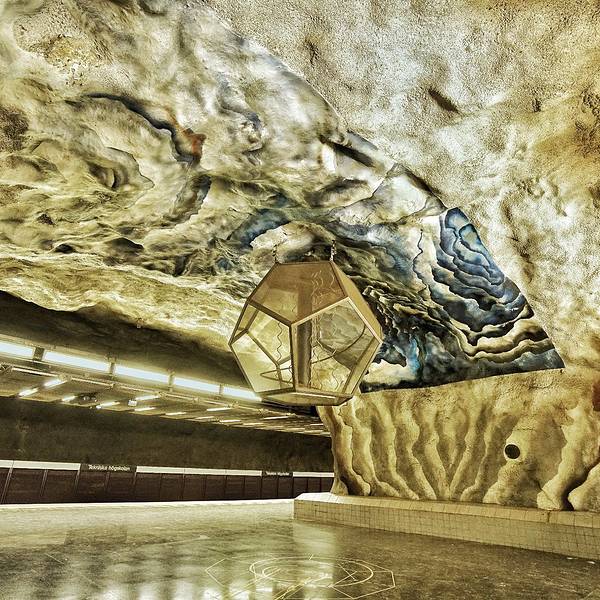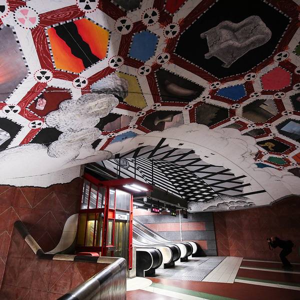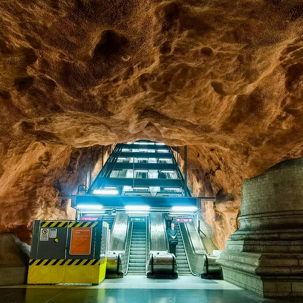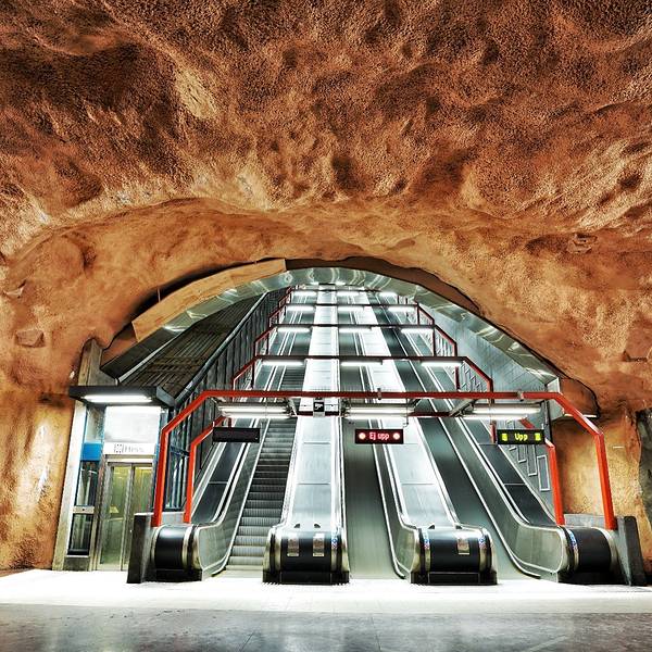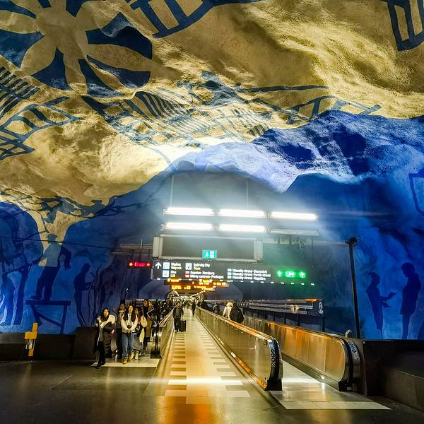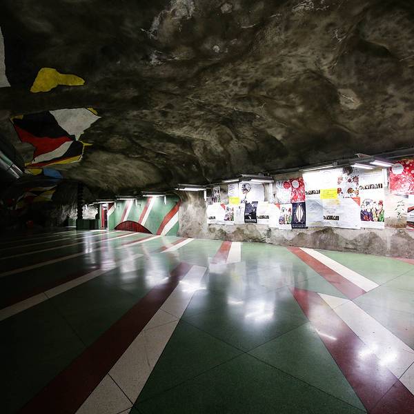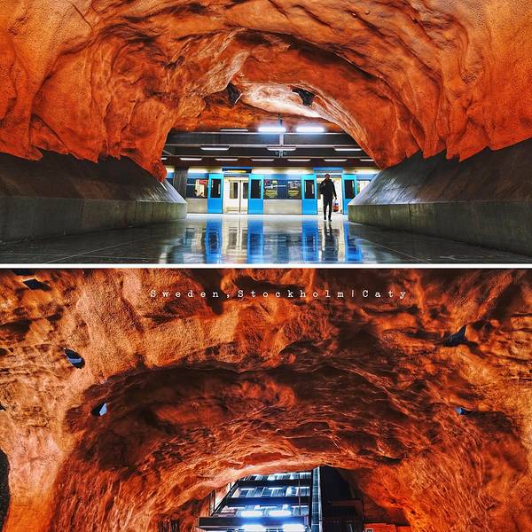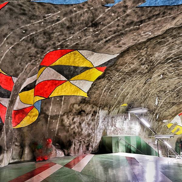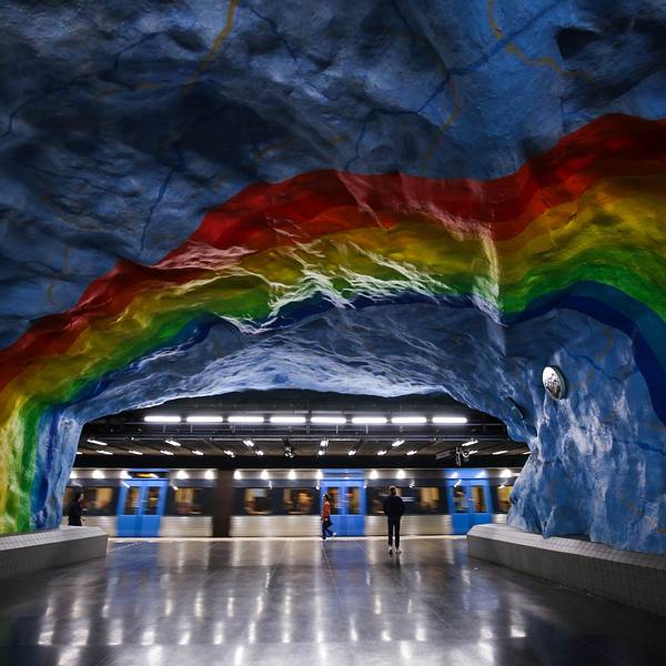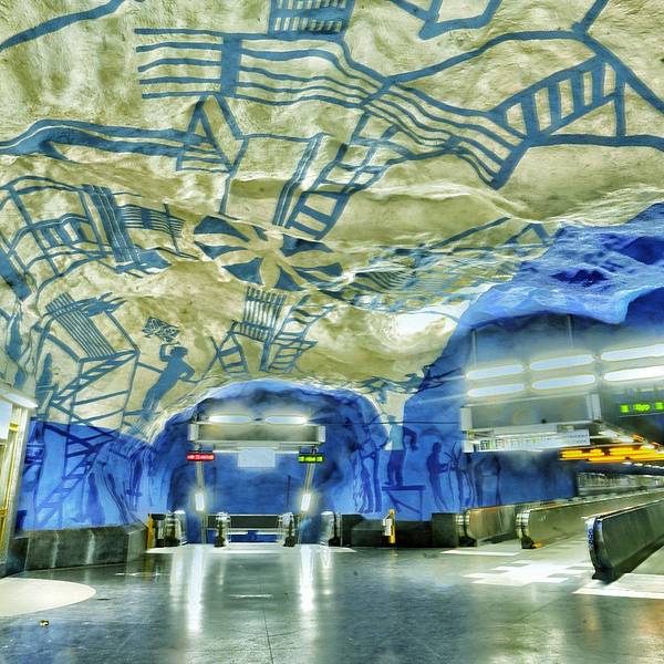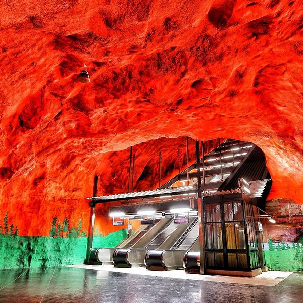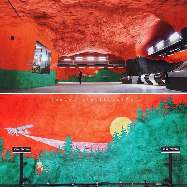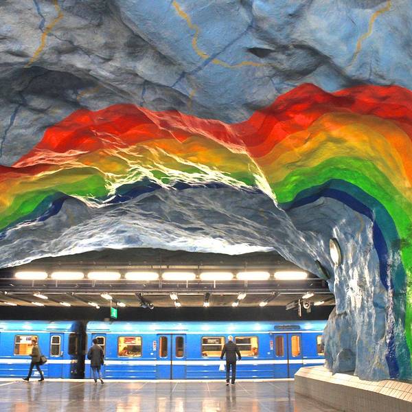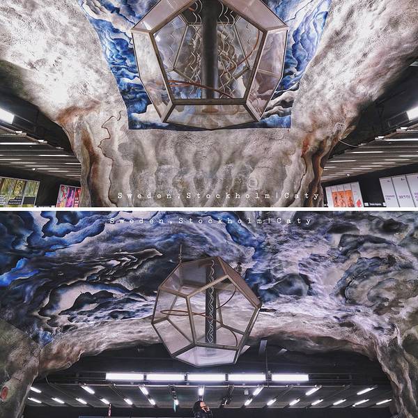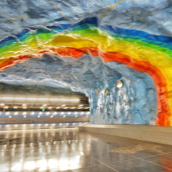 这座地铁站的七彩墙绘是为了纪念1912年在斯德哥尔摩举办的奥林匹克盛事。整座地铁站岩壁被涂成了天空的颜色,而一弯绚丽的彩虹横跨于拱形岩壁之上,让人不自觉的愉悦起来。Solna Centrum(地铁蓝线)T-Centralen(地铁中央站)